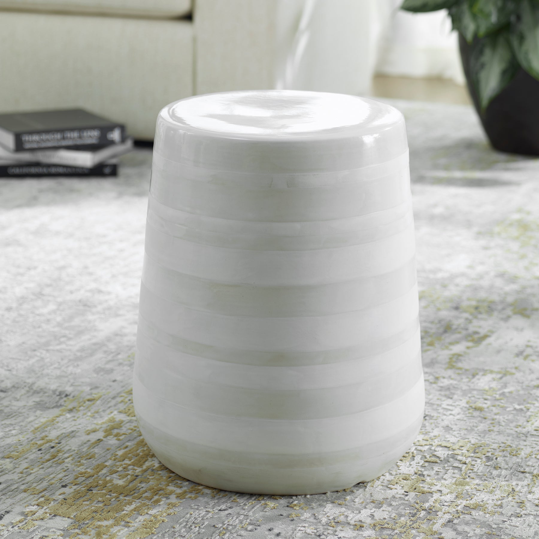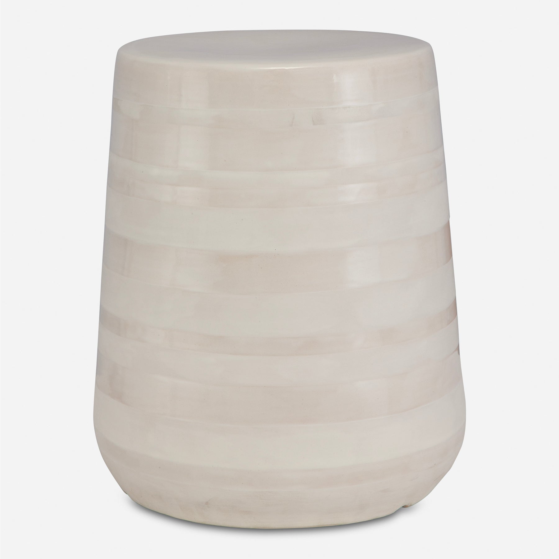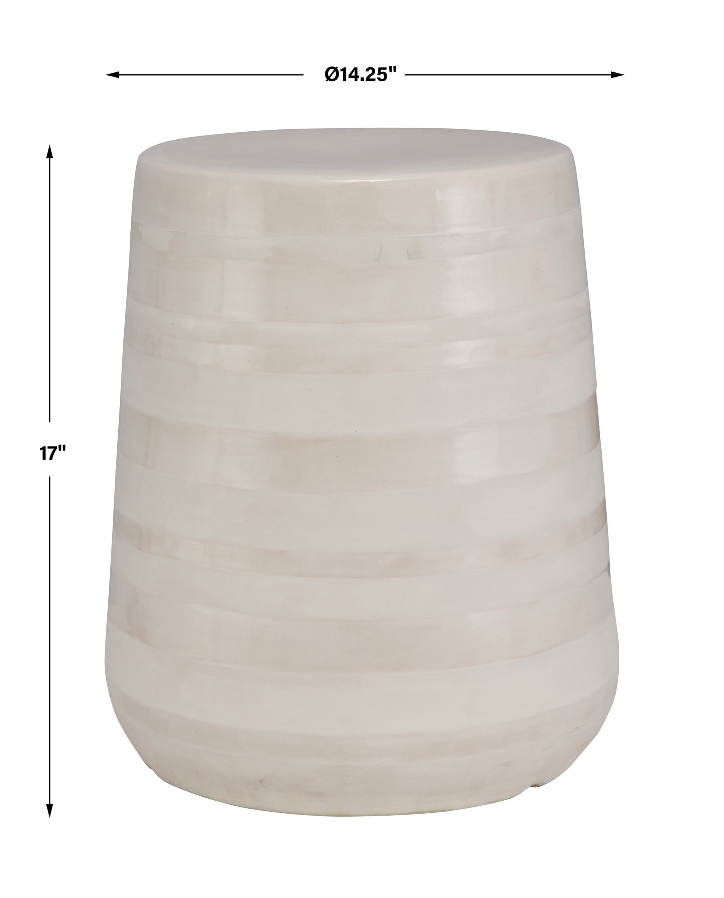 Inspired by tonal landscapes, the Desert Plains Garden Stool features a striped effect from gloss and matte white glazes. May be used outdoors, but protection from freezing temperatures is recommended.
