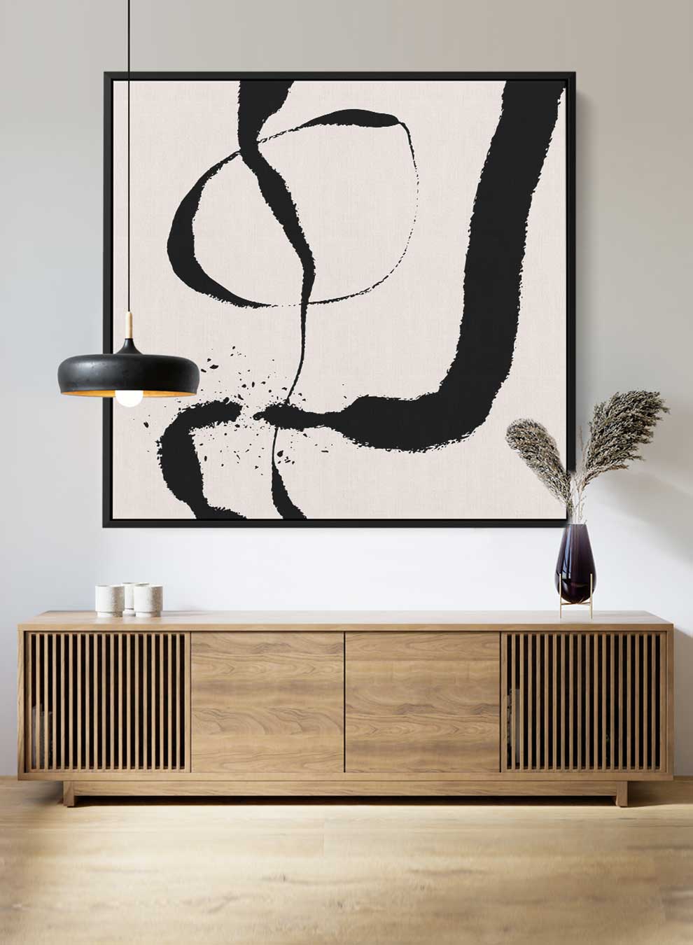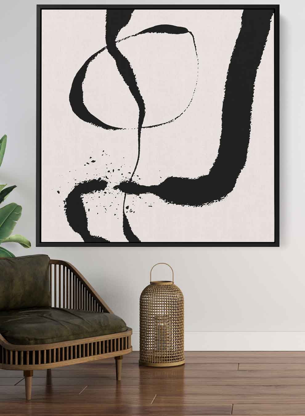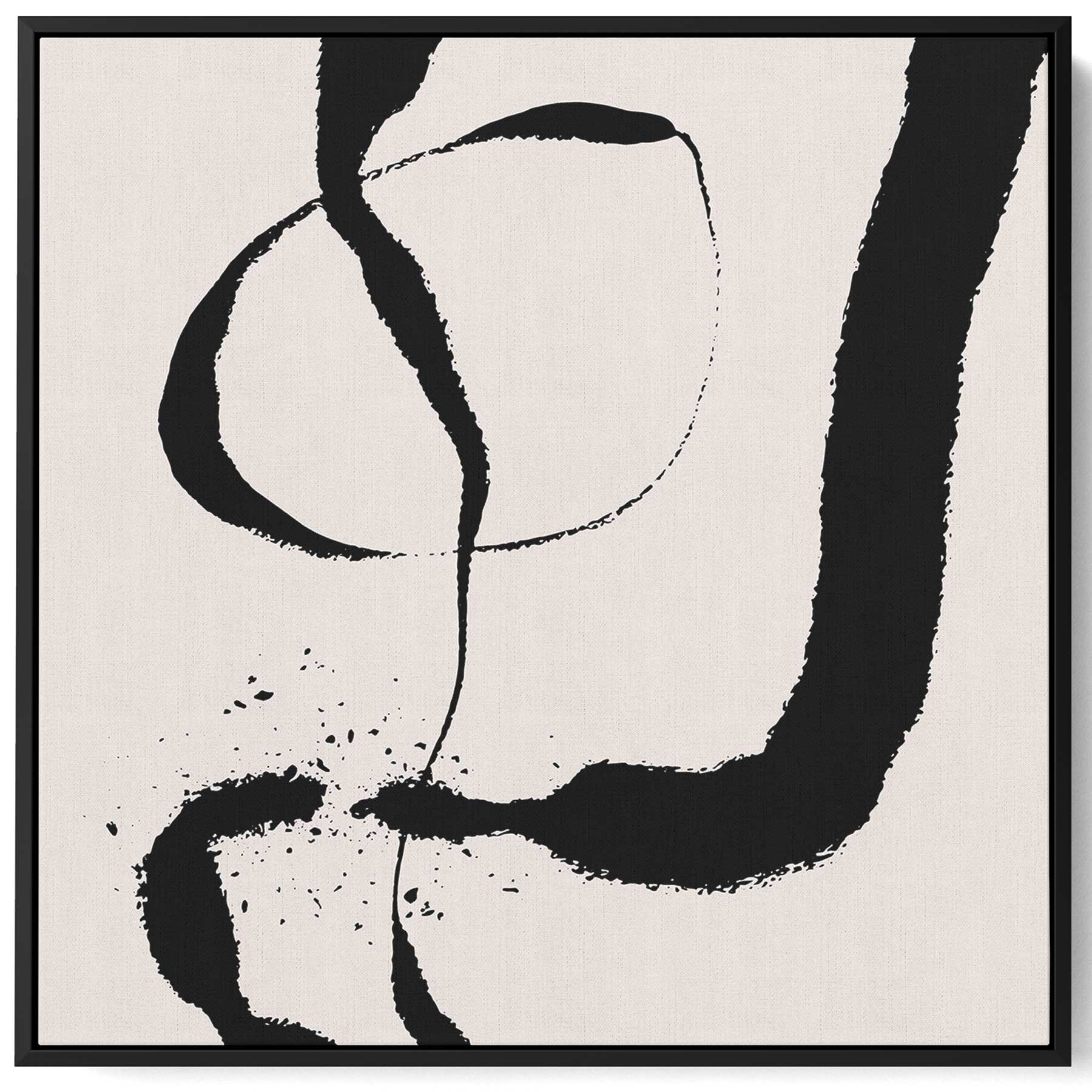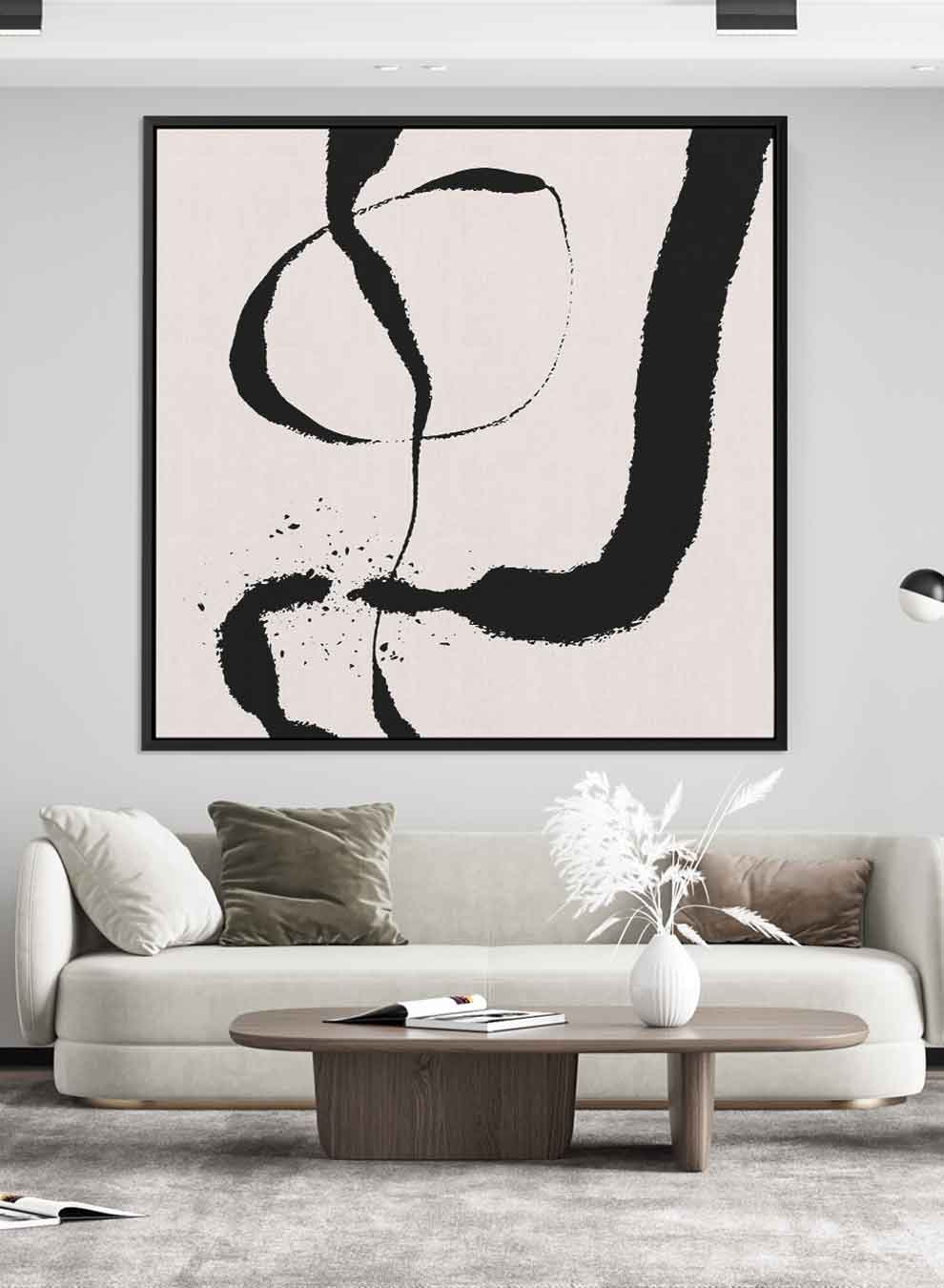 Square Canvas Wall Art Stretched Over Wooden Frame with Black Floating Frame and Black Abstract Painting