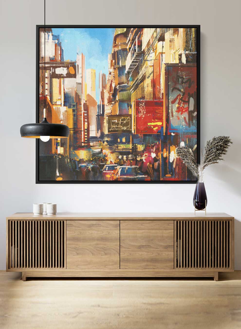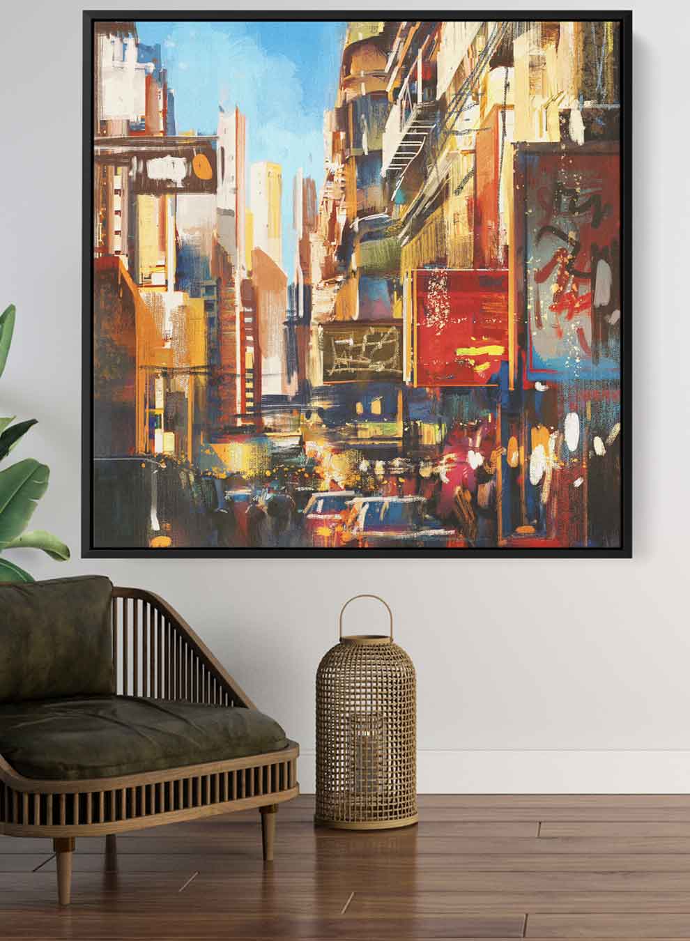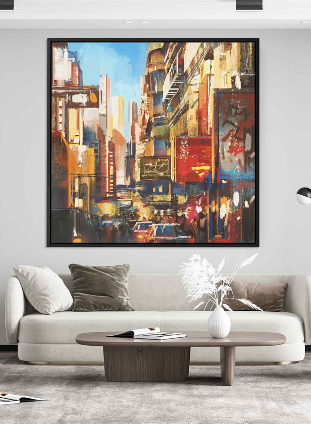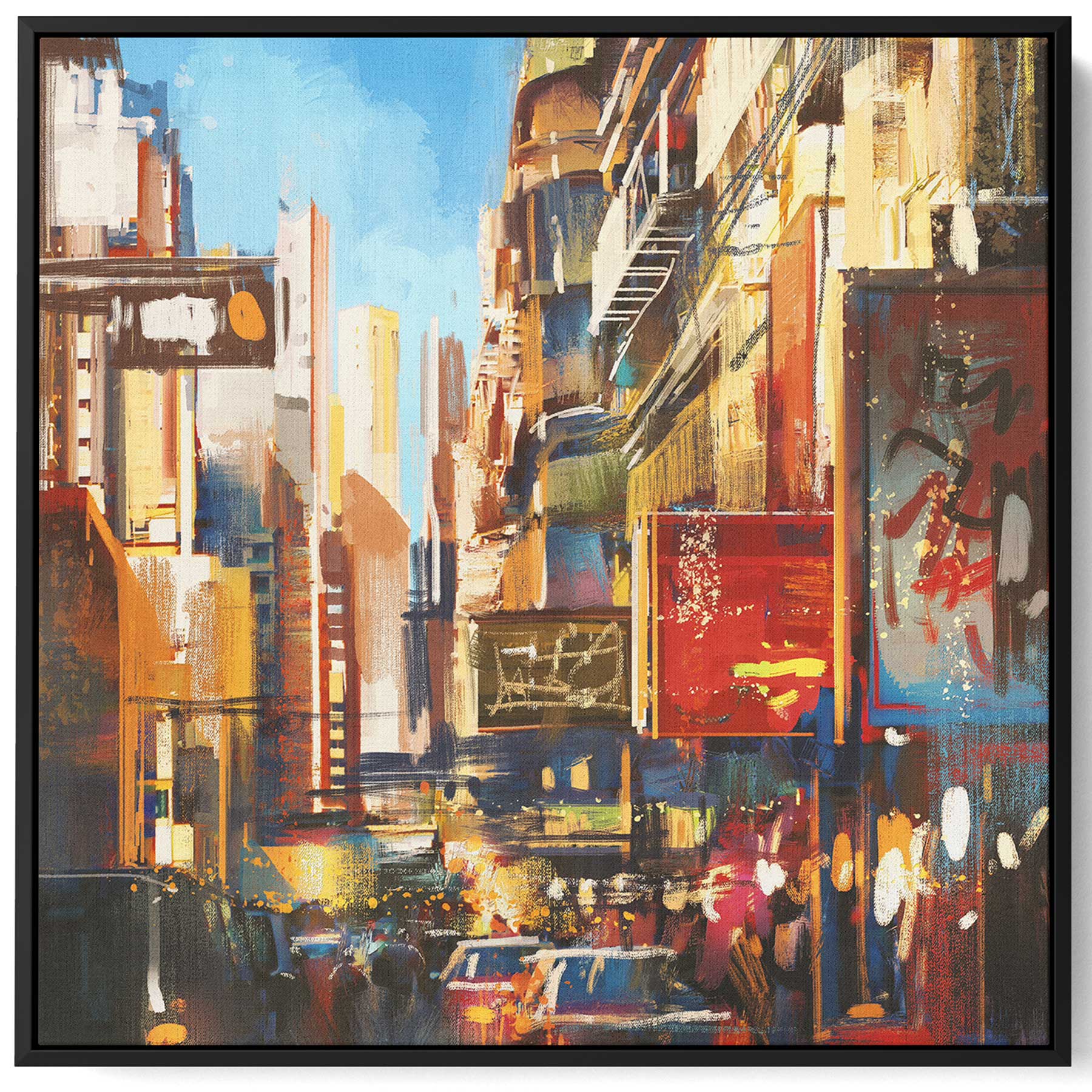 Square Canvas Wall Art Stretched Over Wooden Frame with Black Floating Frame and Colorful City View Painting