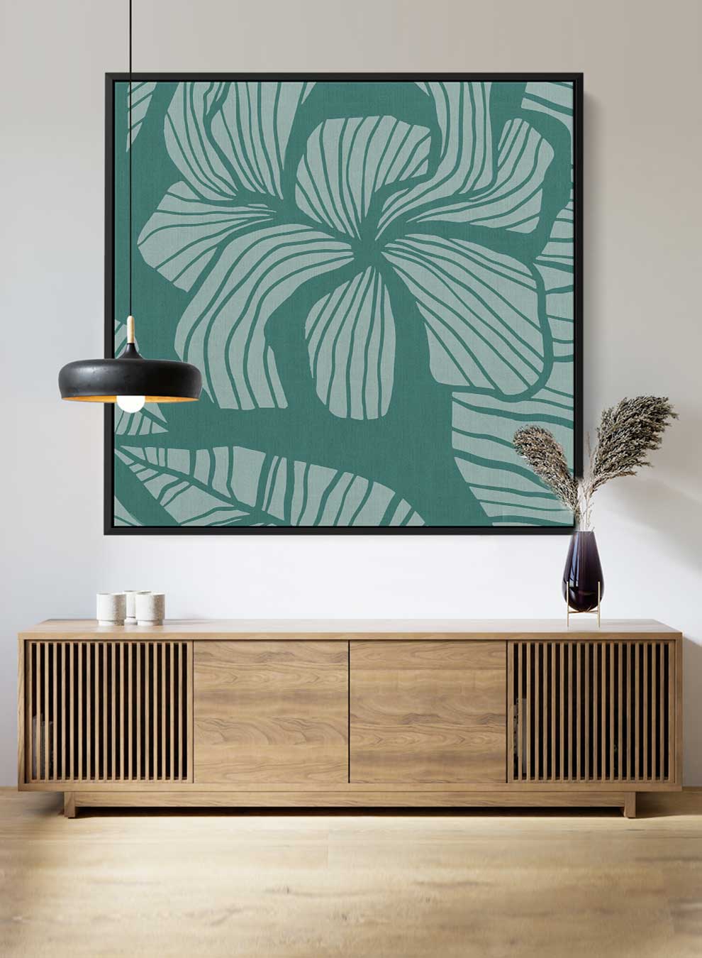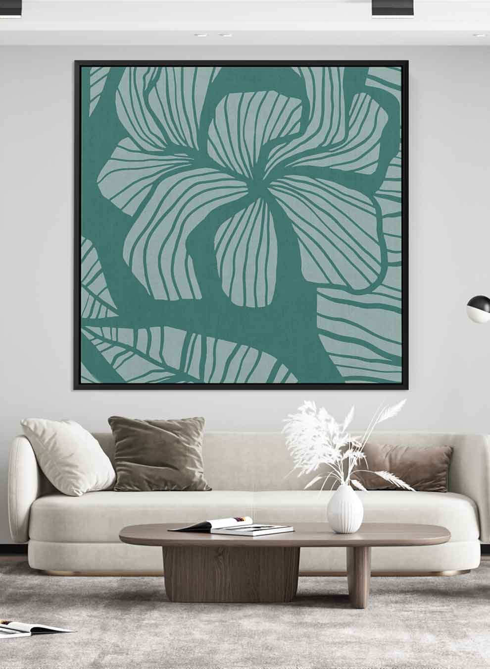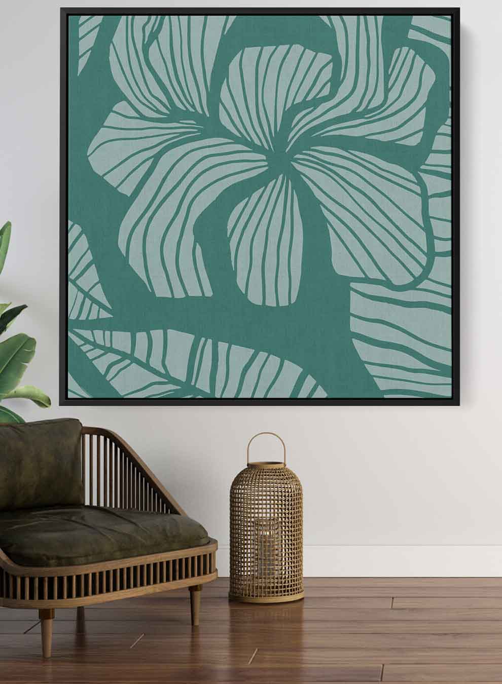 Square Canvas Wall Art Stretched Over Wooden Frame with Black Floating Frame and Floral Art Pattern Painting
