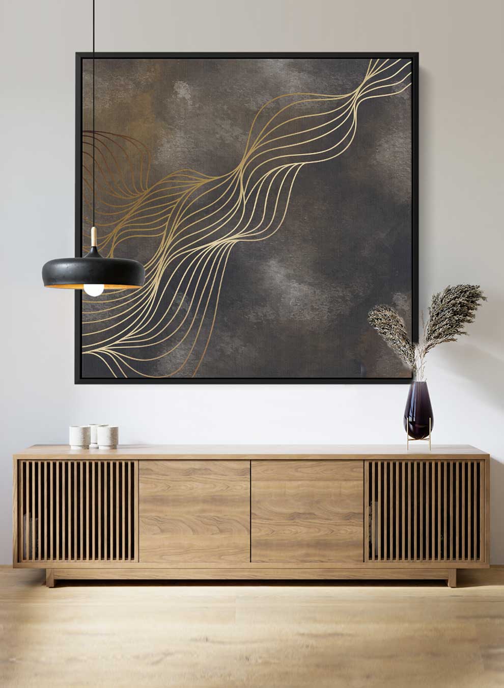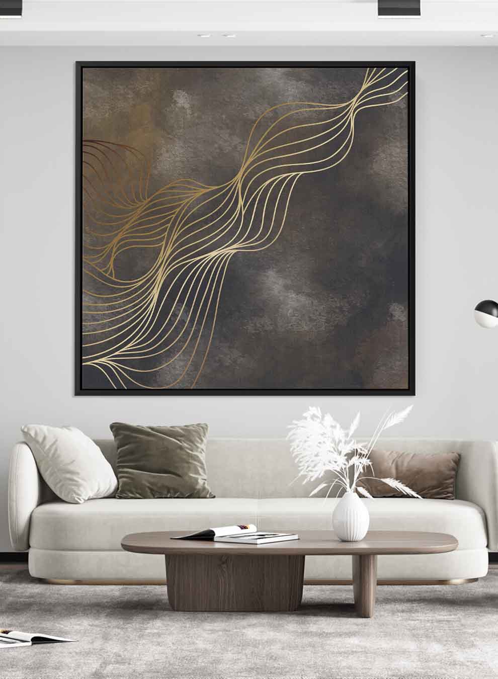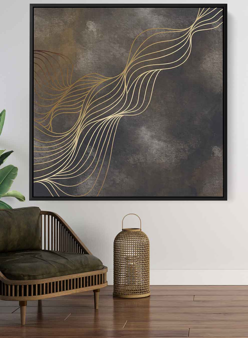 Square Canvas Wall Art Stretched Over Wooden Frame with Black Floating Frame and Gold Abstract Painting