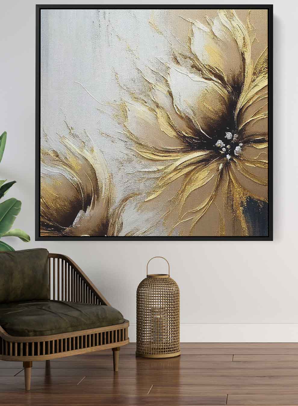 Square Canvas Wall Art Stretched Over Wooden Frame with Black Floating Frame and Golden Flower Painting