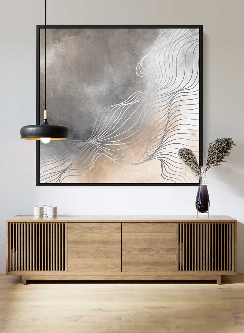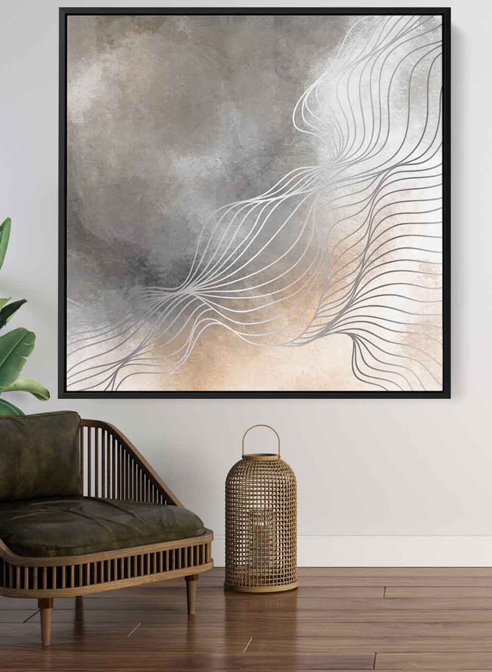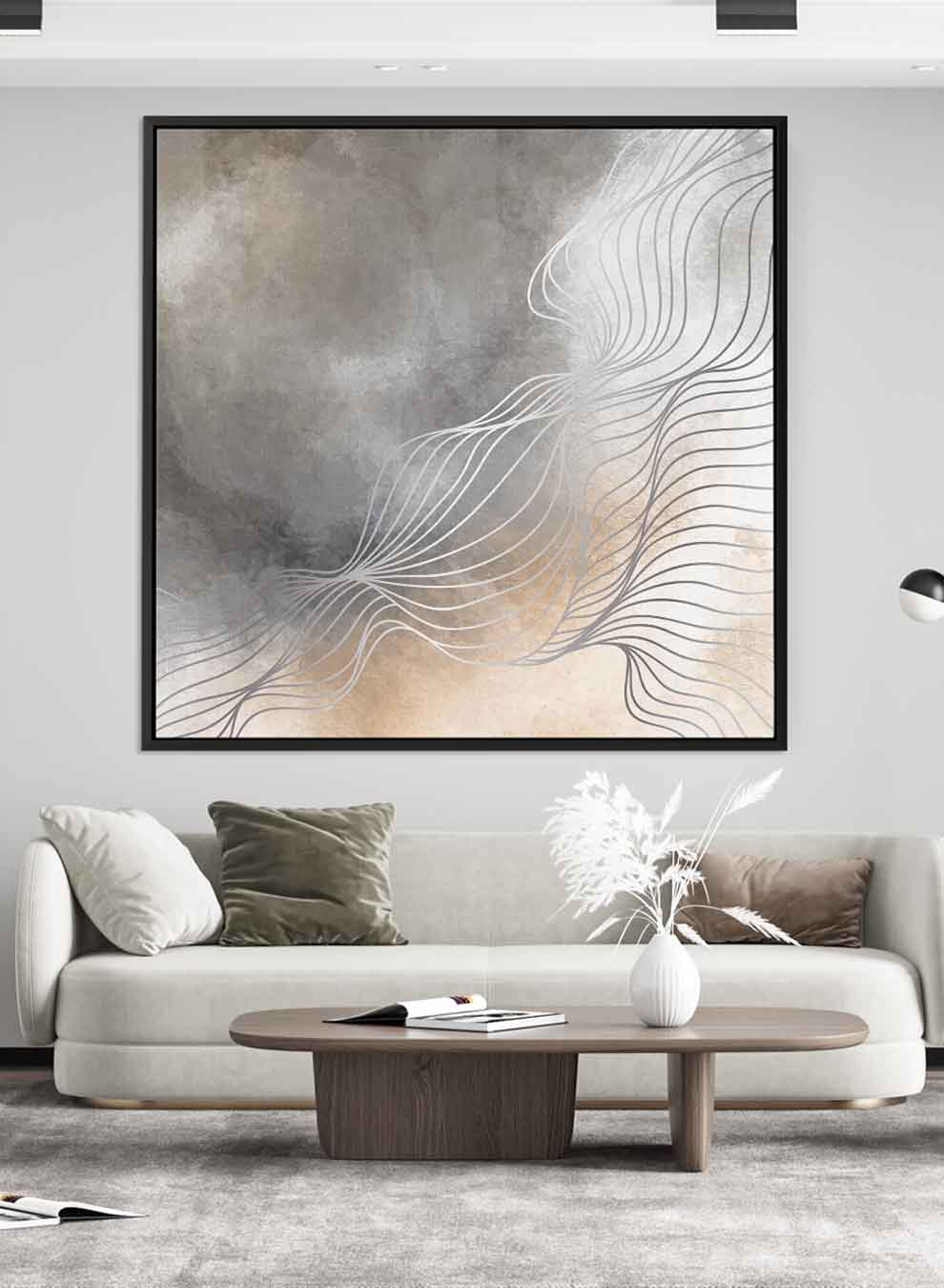 Square Canvas Wall Art Stretched Over Wooden Frame with Black Floating Frame and Grey Abstract Painting
