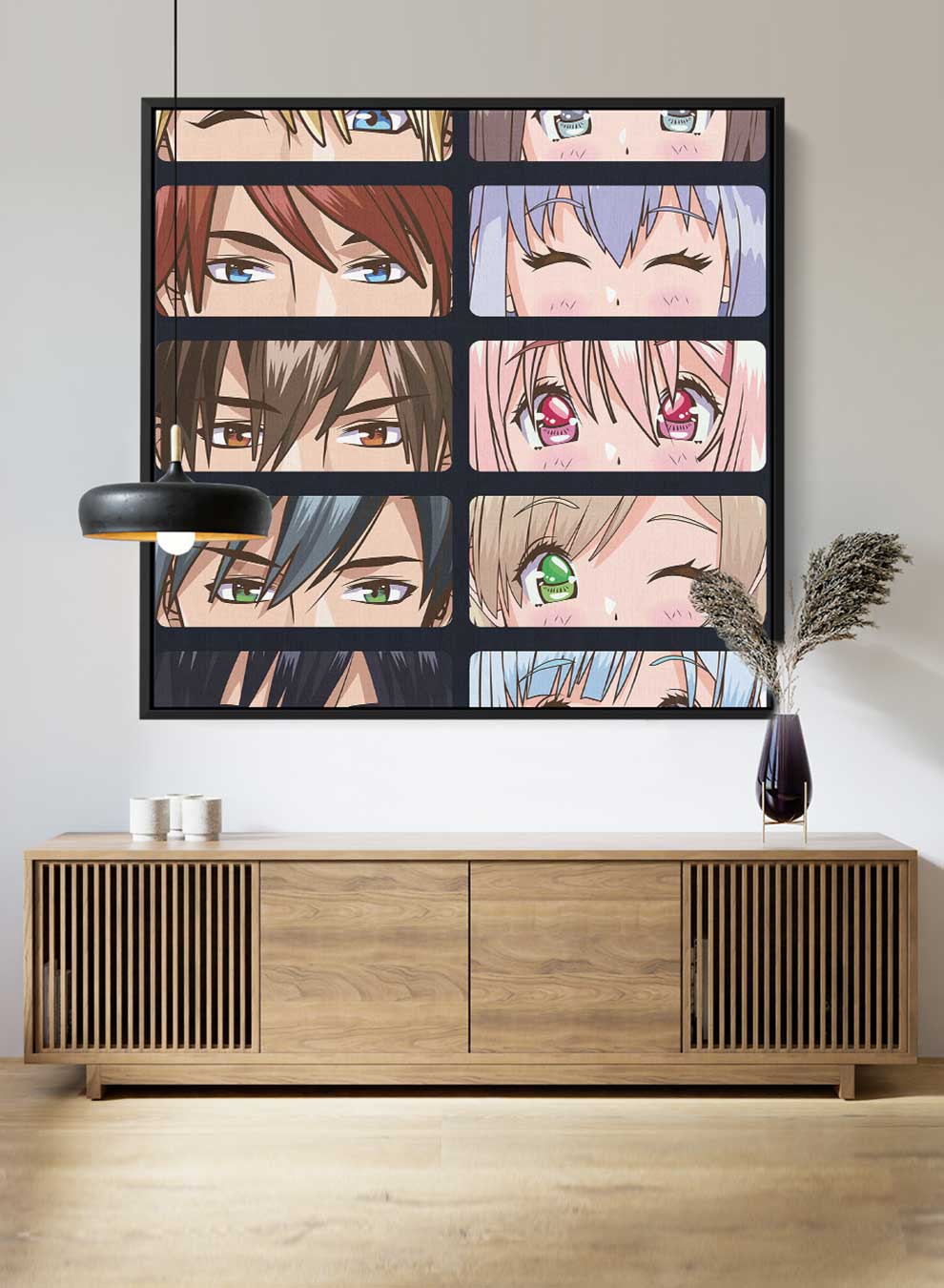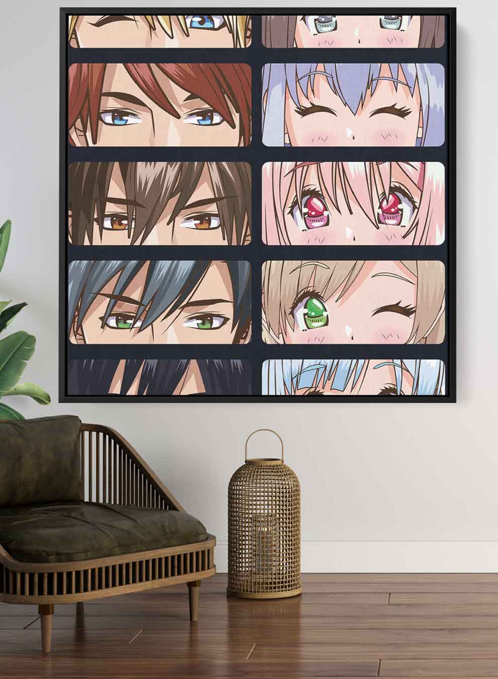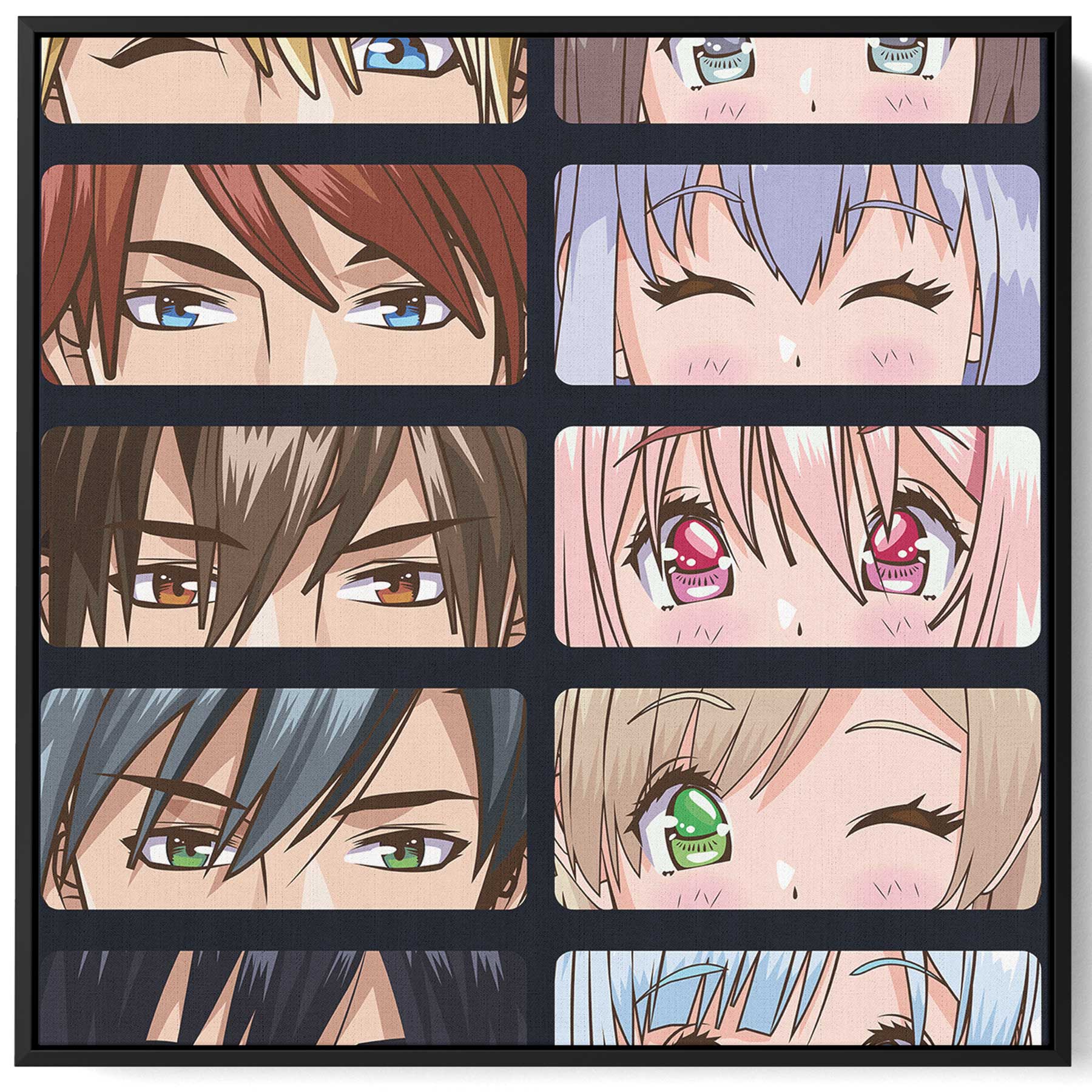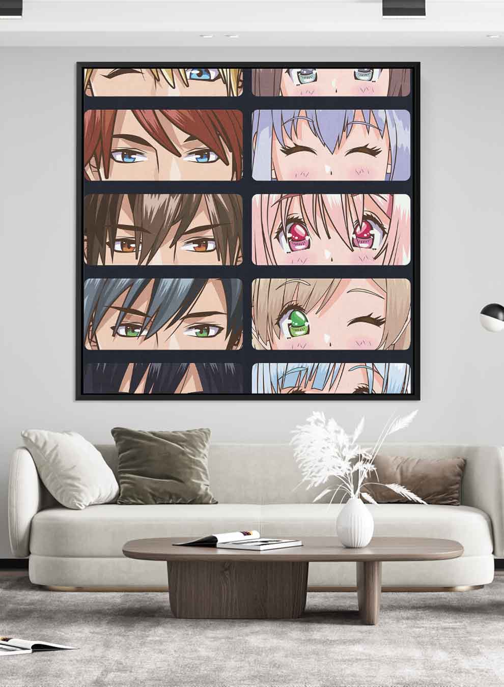 Square Canvas Wall Art Stretched Over Wooden Frame with Black Floating Frame and Group Of Young People Anime Painting