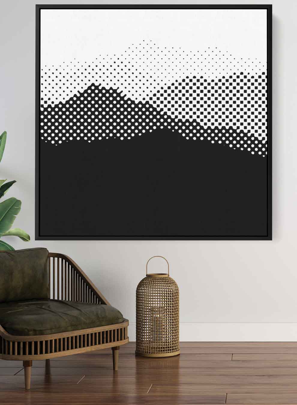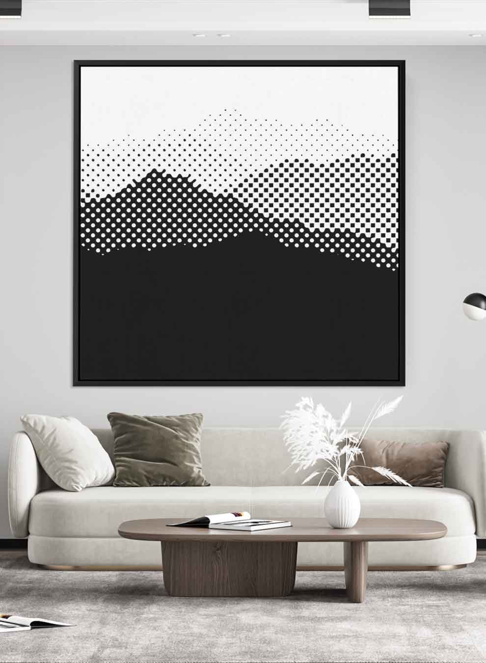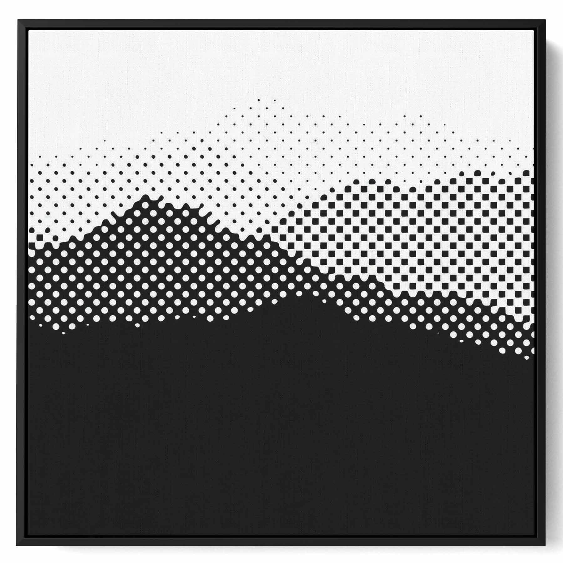 Square Canvas Wall Art Stretched Over Wooden Frame with Black Floating Frame and High Mountains Painting