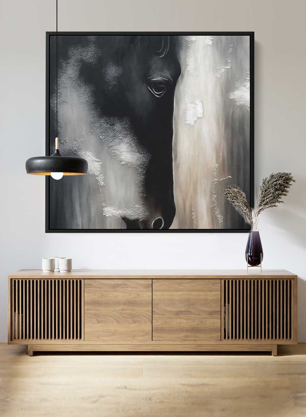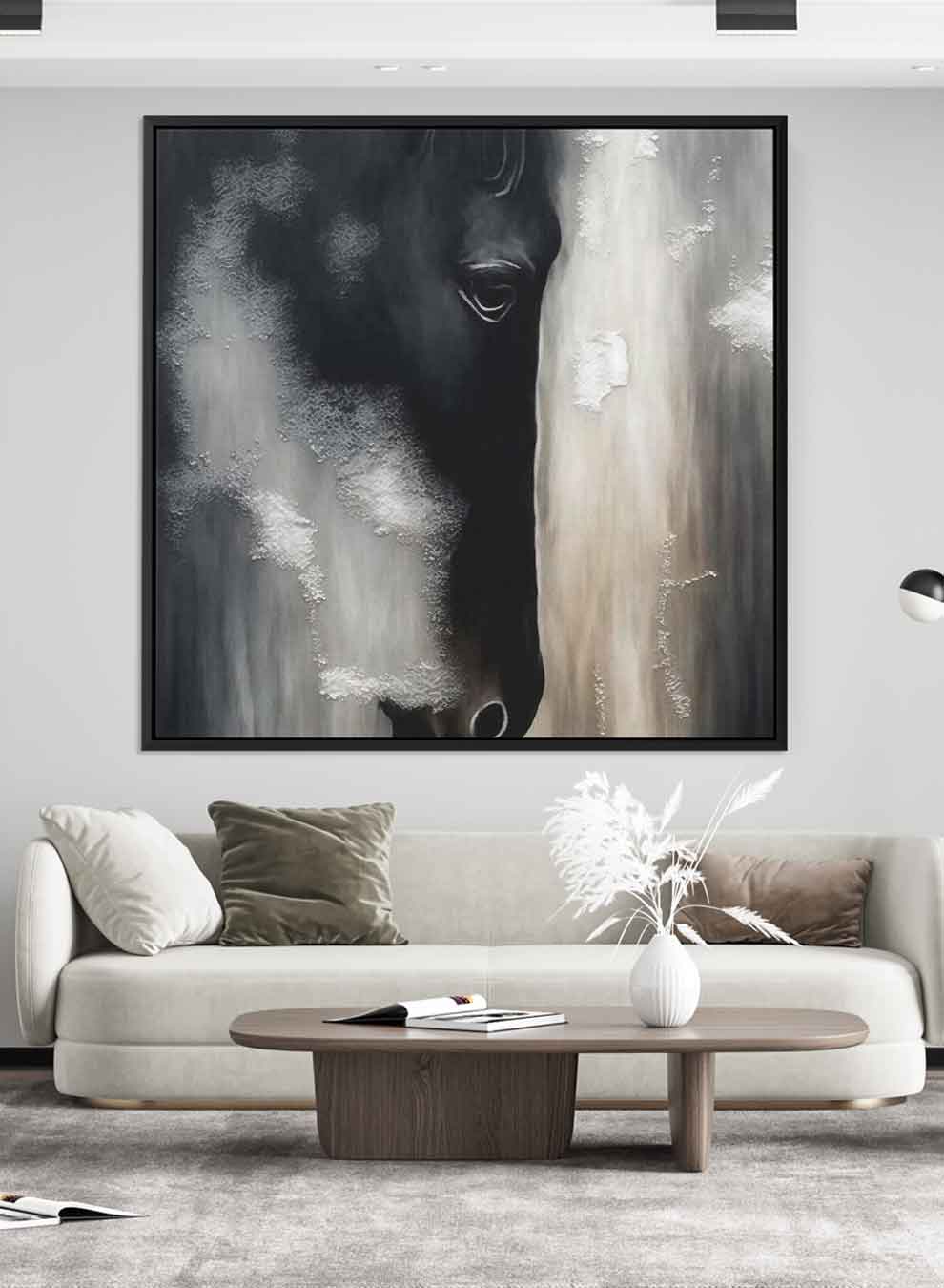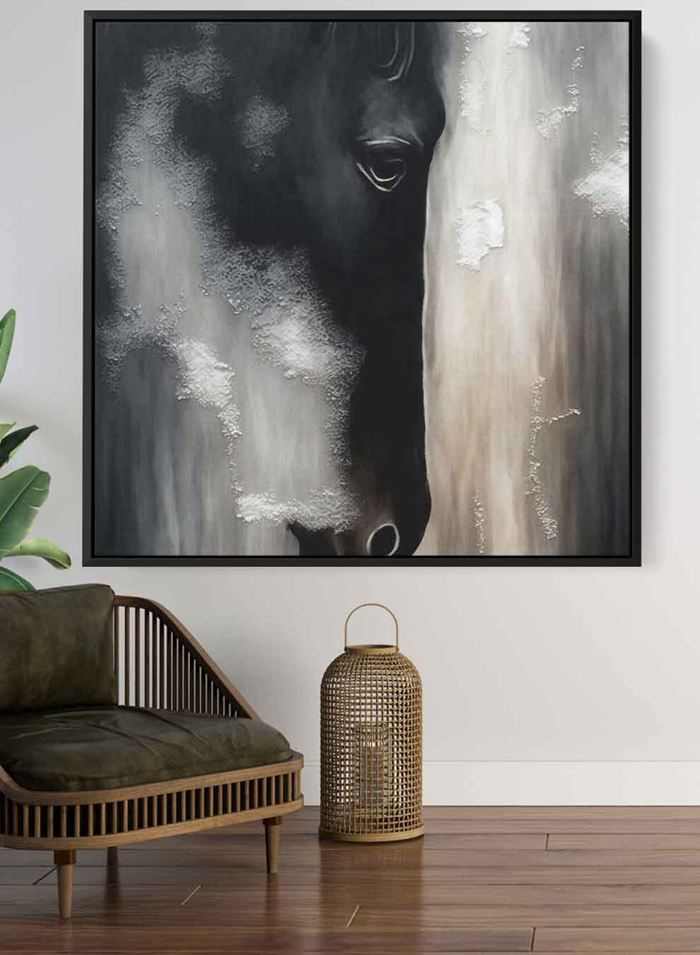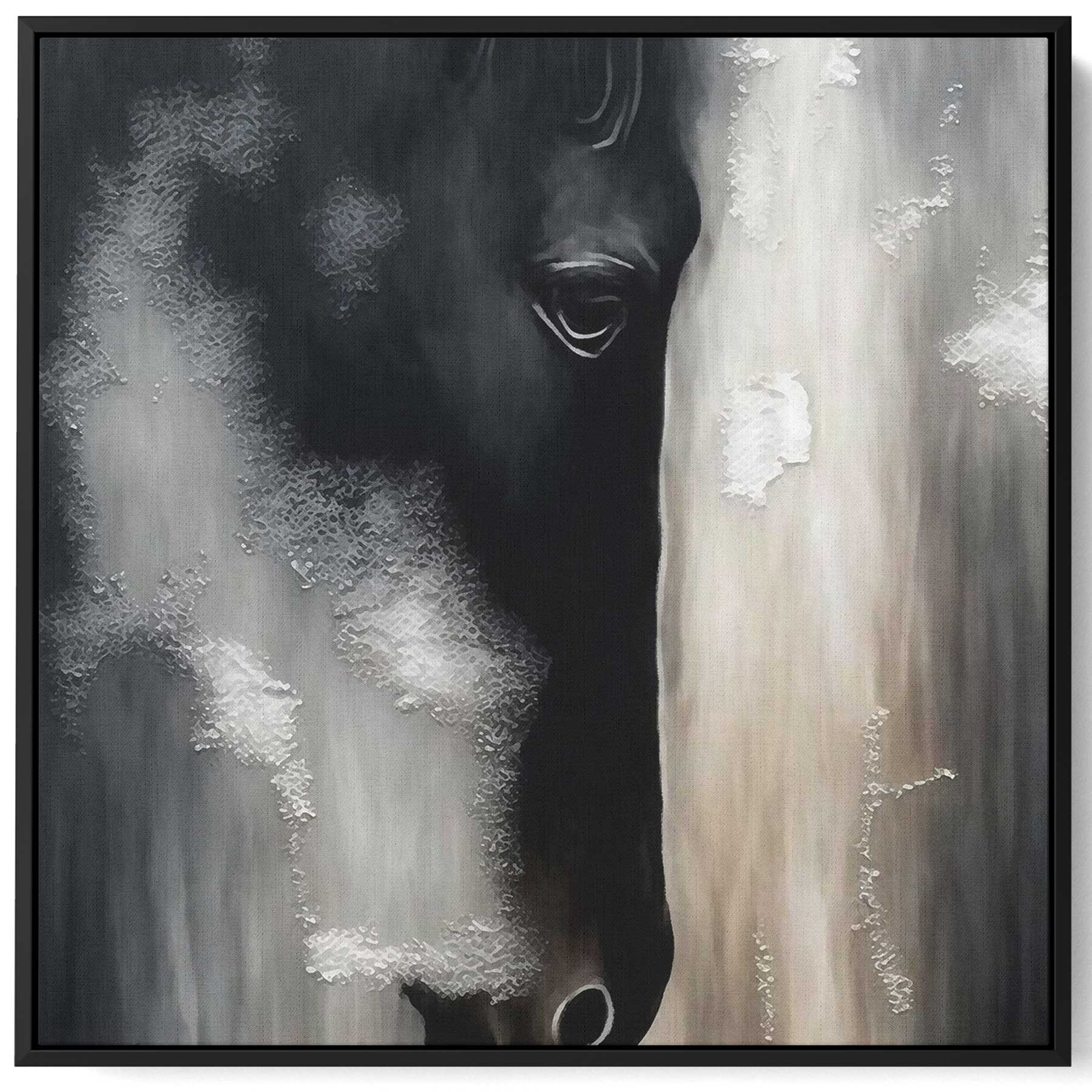 Square Canvas Wall Art Stretched Over Wooden Frame with Black Floating Frame and Horse Face Abstract Painting