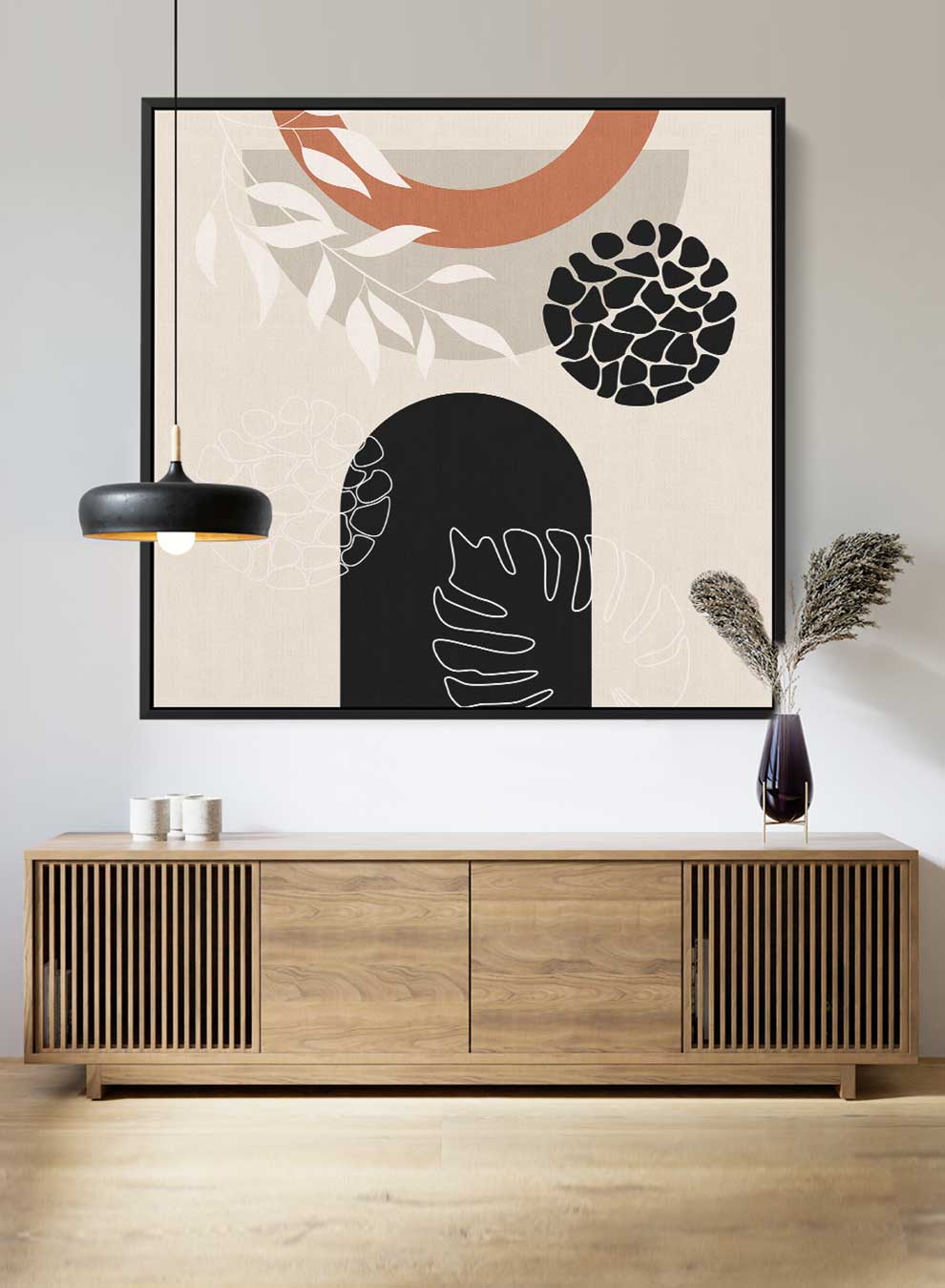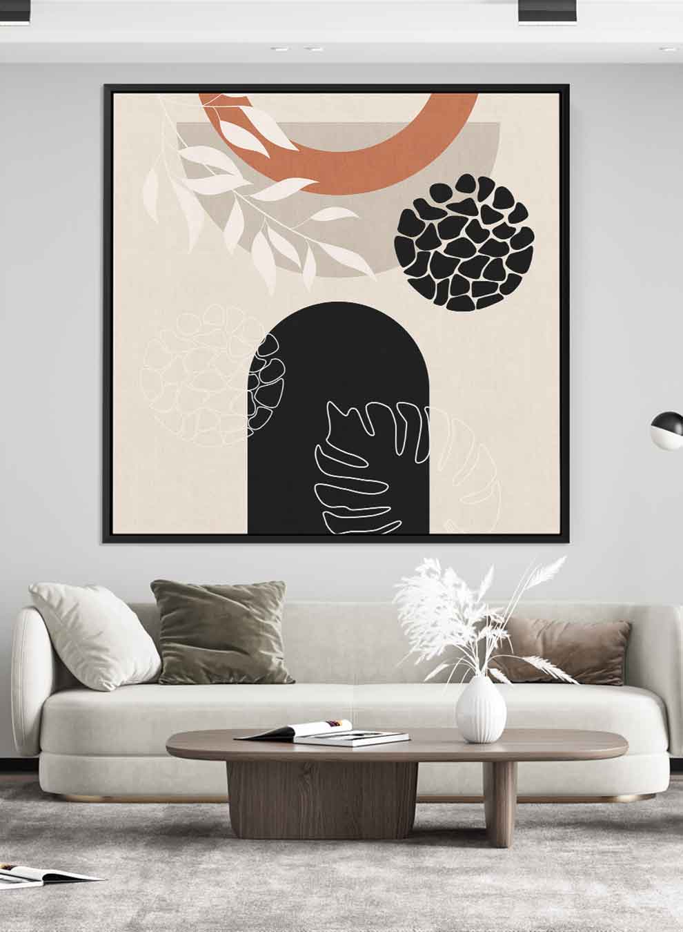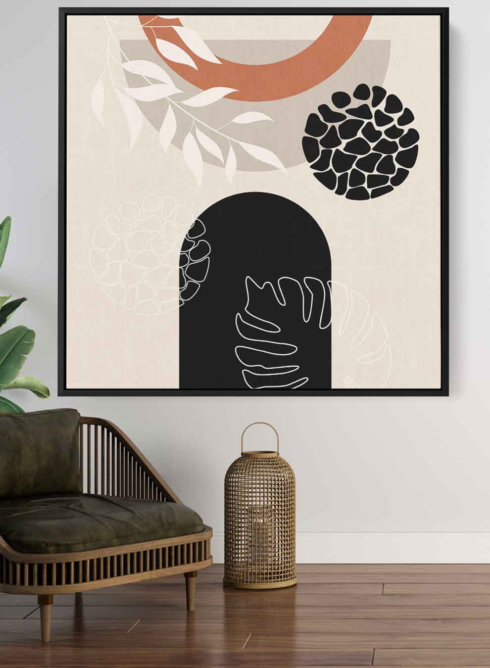 Square Canvas Wall Art Stretched Over Wooden Frame with Black Floating Frame and Leaves Abstract Art