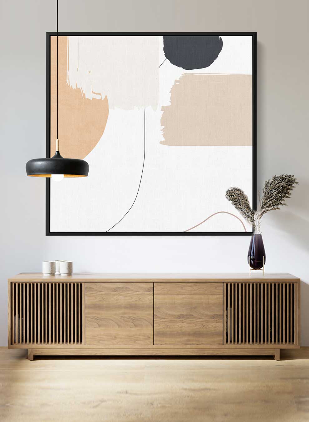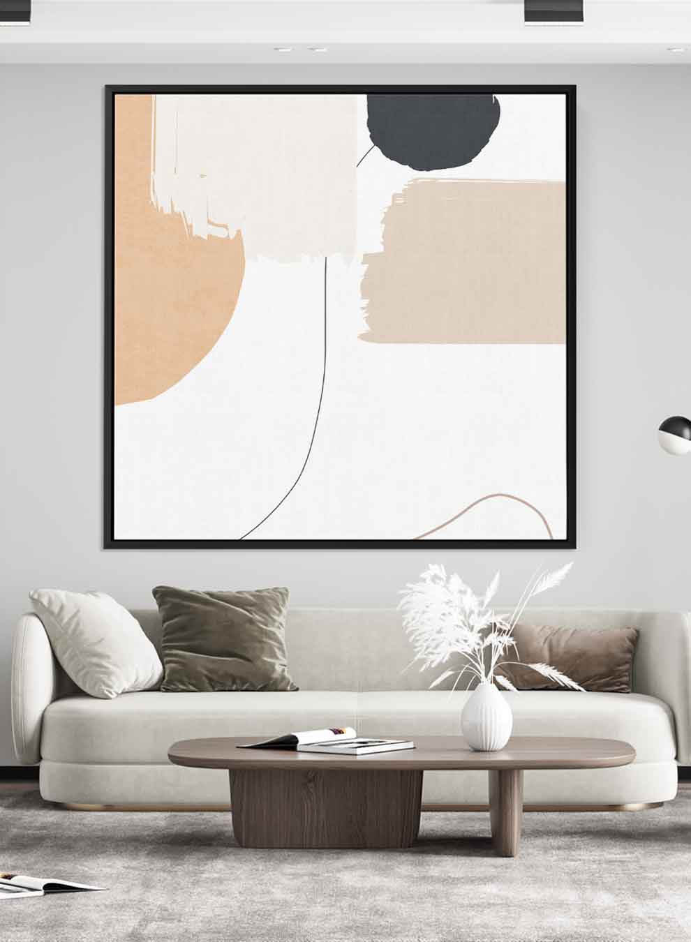 Square Canvas Wall Art Stretched Over Wooden Frame with Black Floating Frame and Light Abstract Art