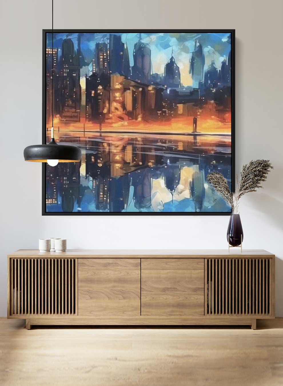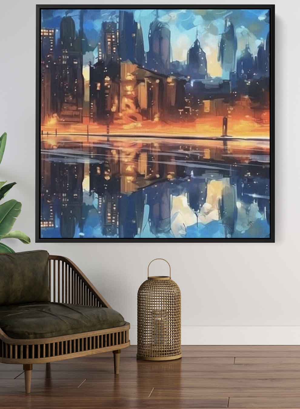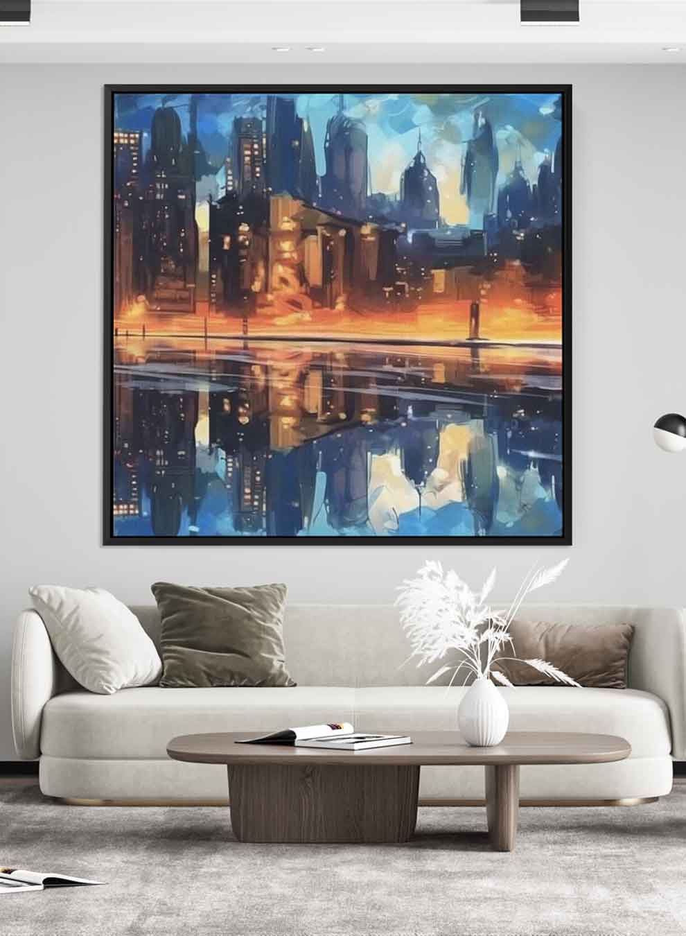 Square Canvas Wall Art Stretched Over Wooden Frame with Black Floating Frame and Man Walking In The City Painting