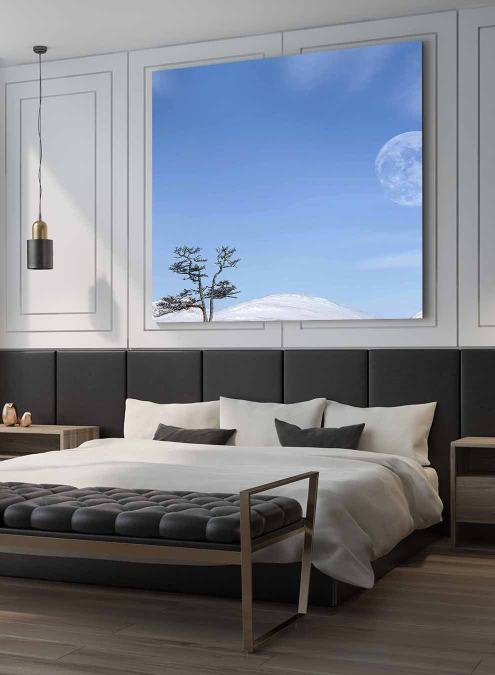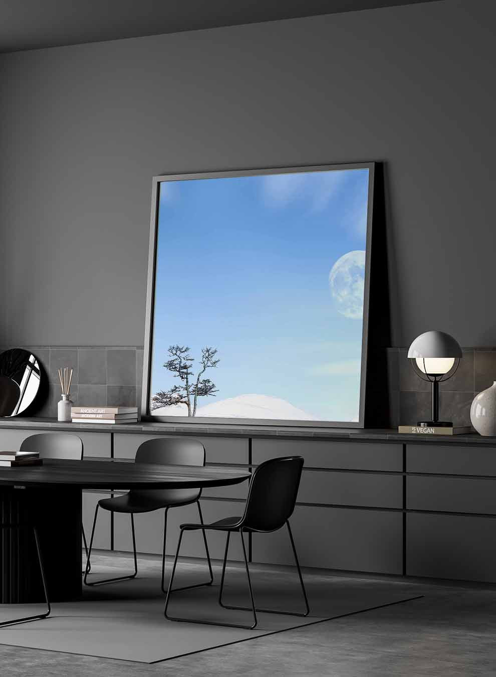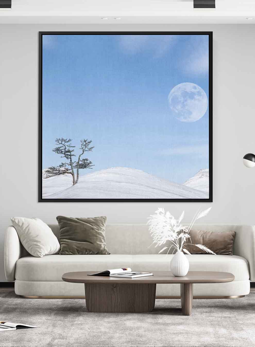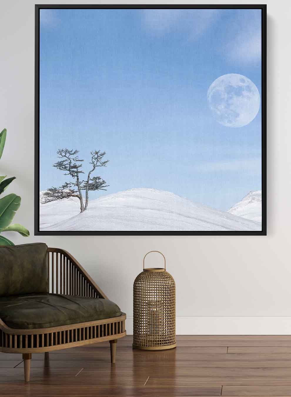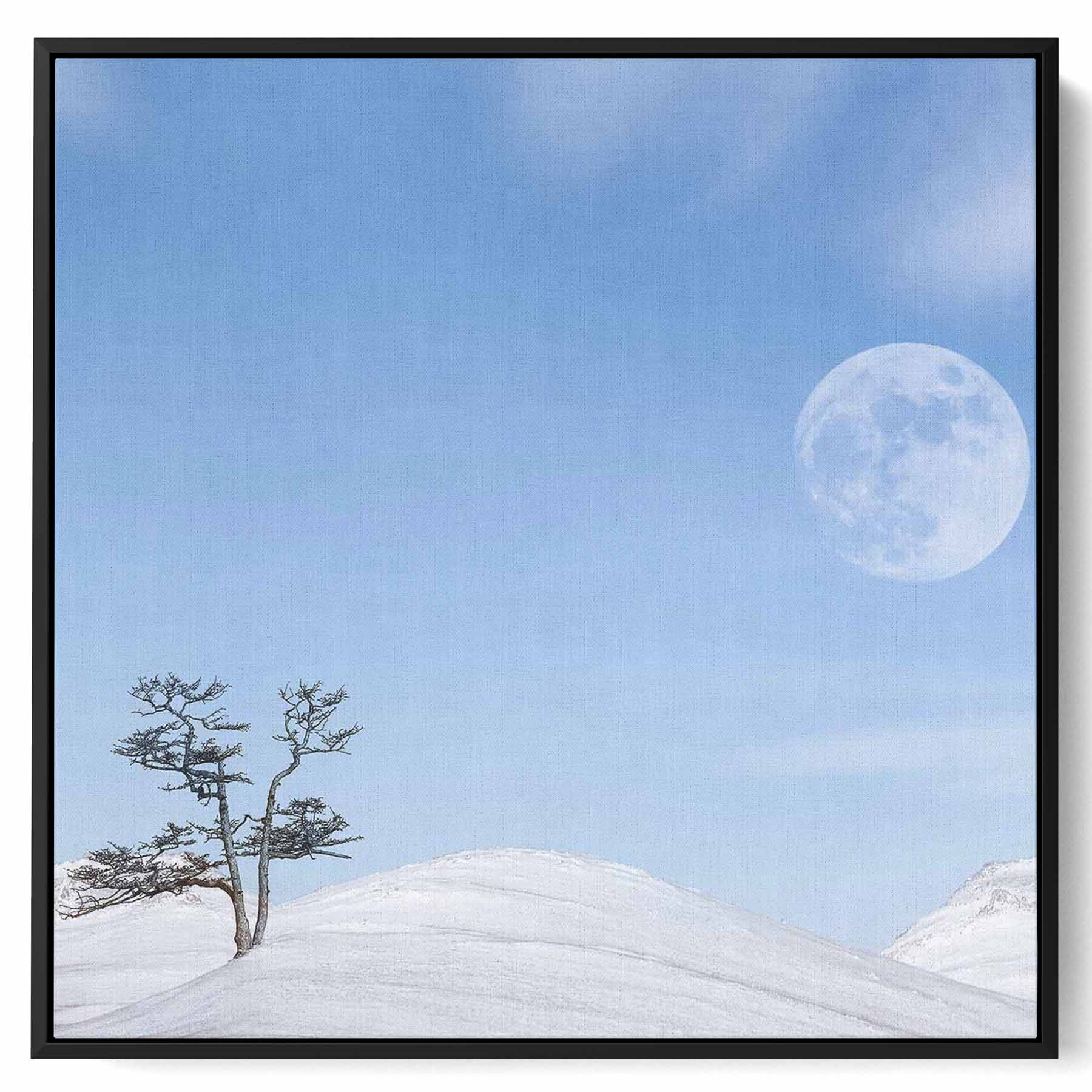 Square Canvas Wall Art Stretched Over Wooden Frame with Black Floating Frame and Moon On The Mountains Painting