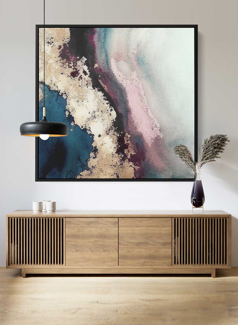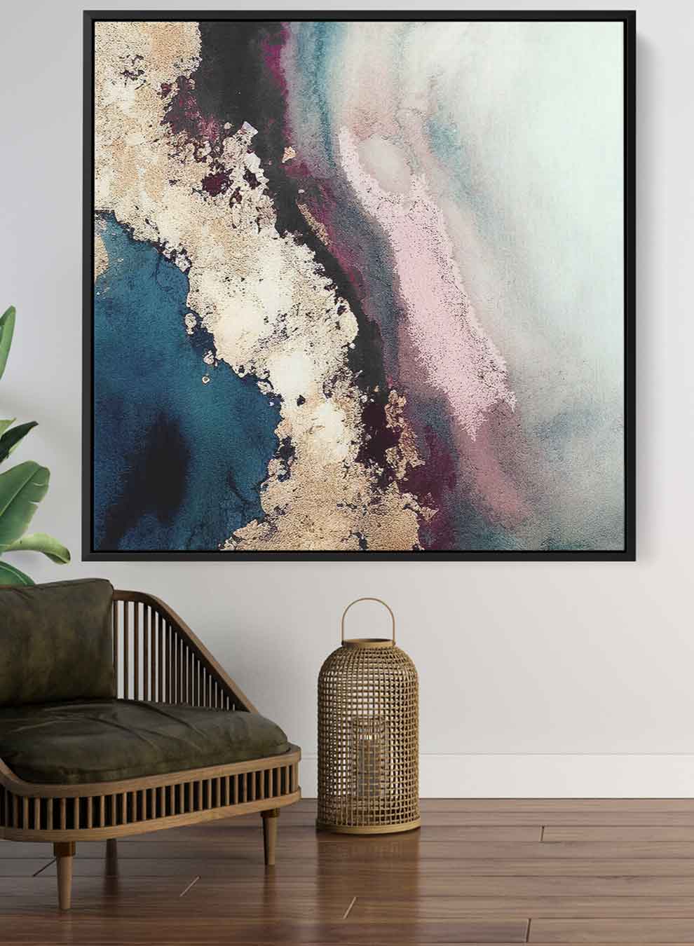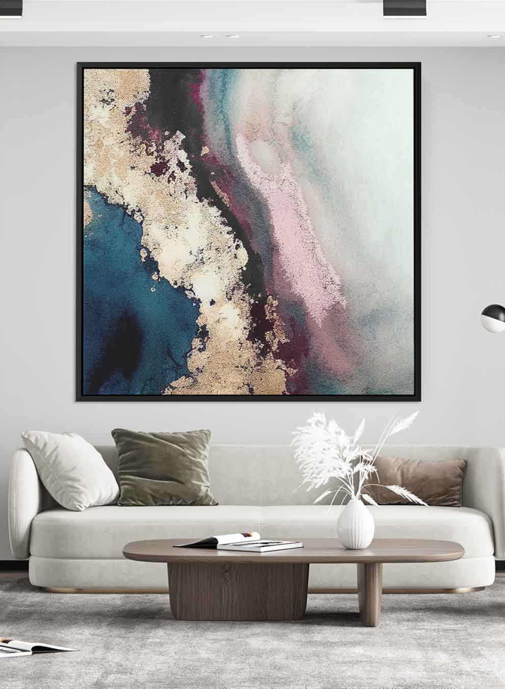 Square Canvas Wall Art Stretched Over Wooden Frame with Black Floating Frame and Multicolor Abstract Painting