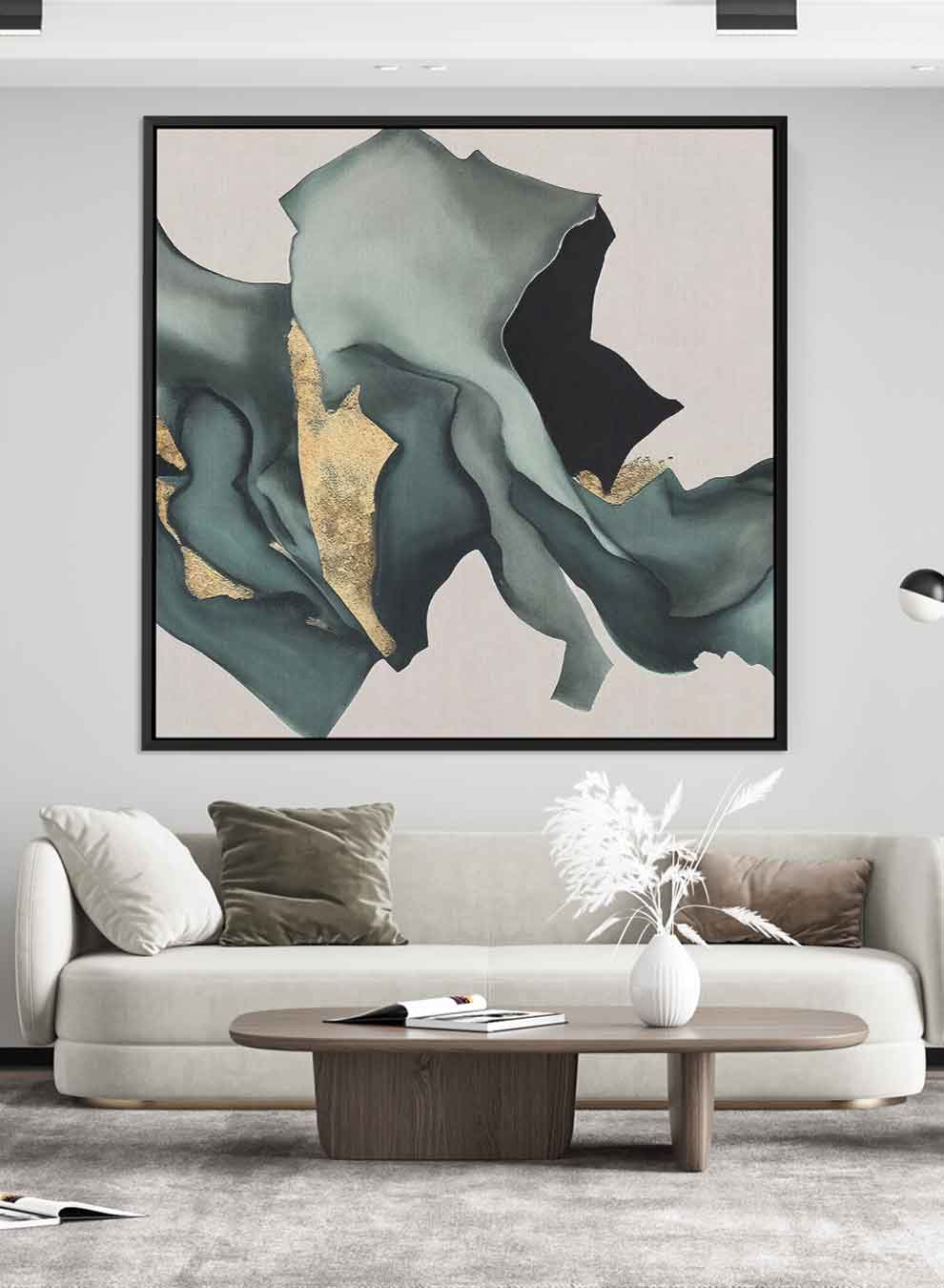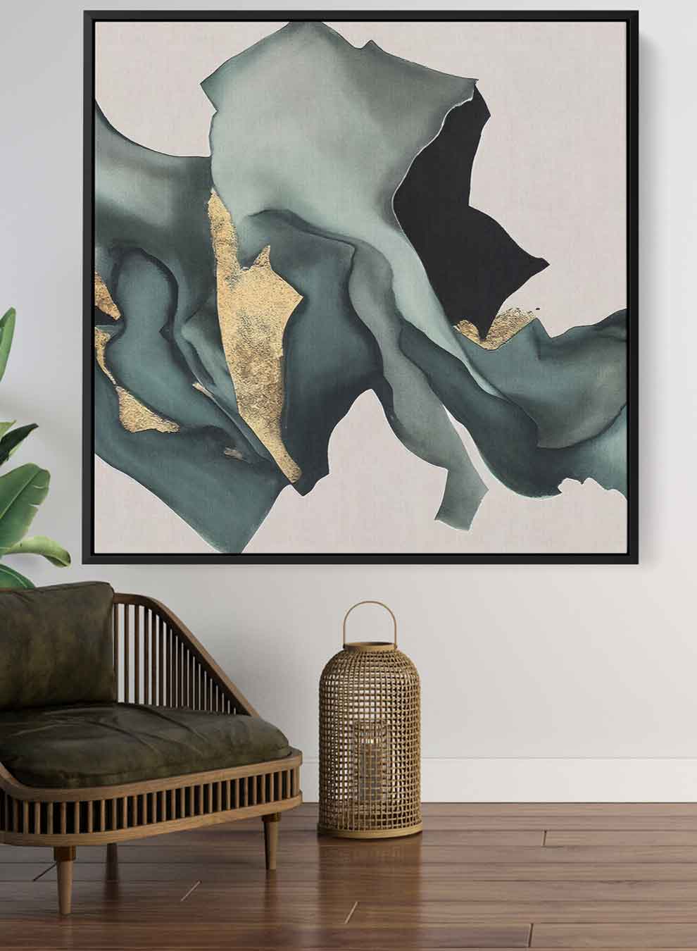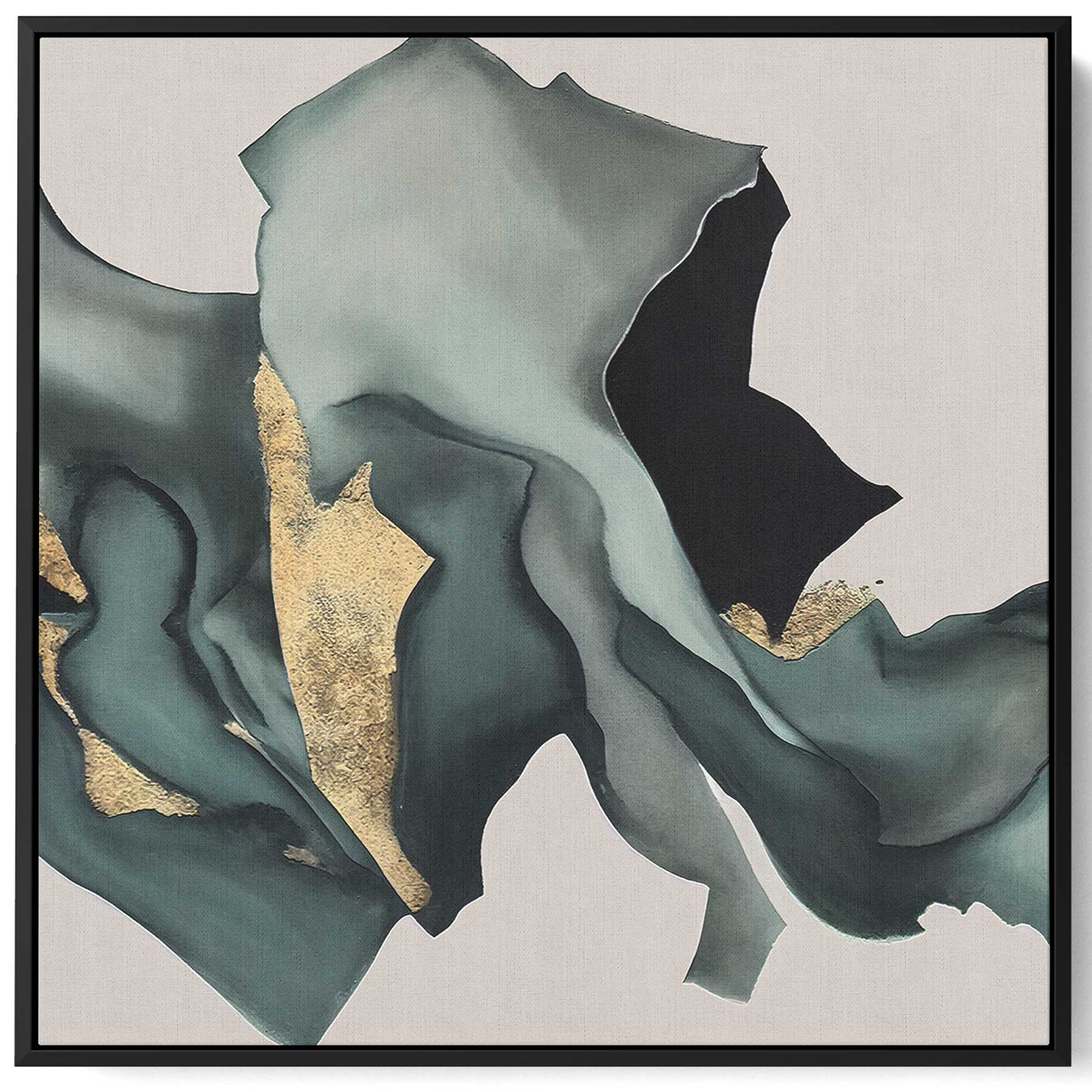 Square Canvas Wall Art Stretched Over Wooden Frame with Black Floating Frame and Pieces Of Fabric Pattern Painting