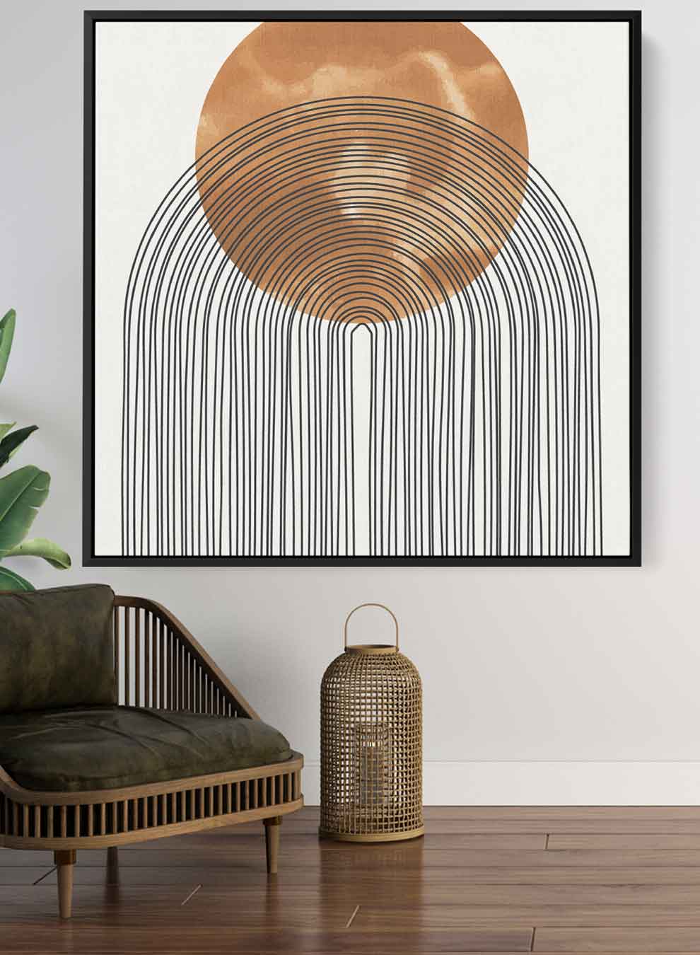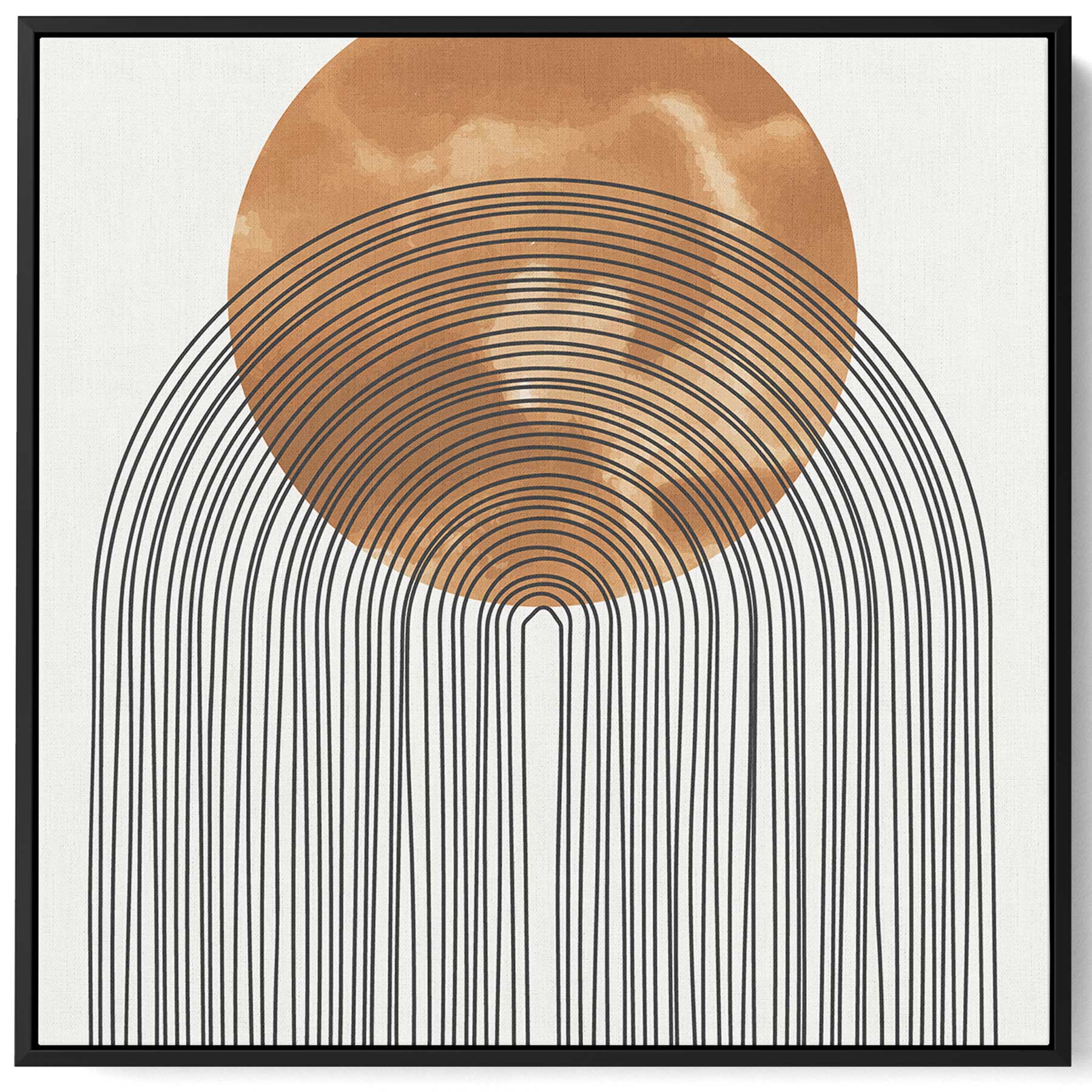 Square Canvas Wall Art Stretched Over Wooden Frame with Black Floating Frame and Sun With Curves Abstract Painting