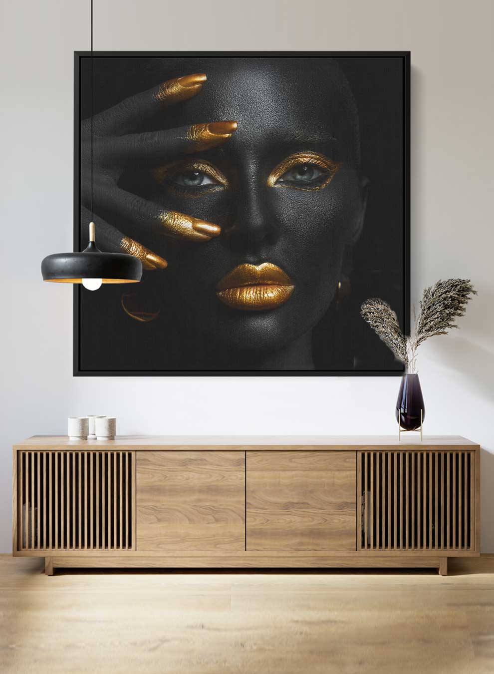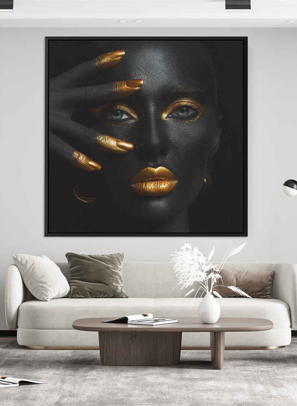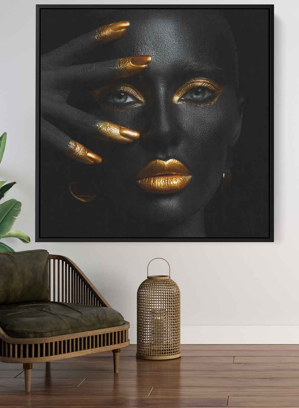 Square Canvas Wall Art Stretched Over Wooden Frame with Black Floating Frame and Woman with Gold Makeup