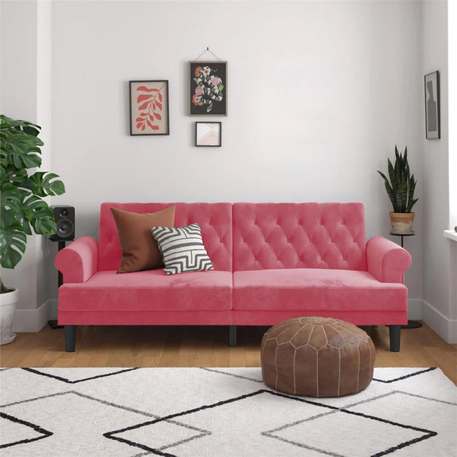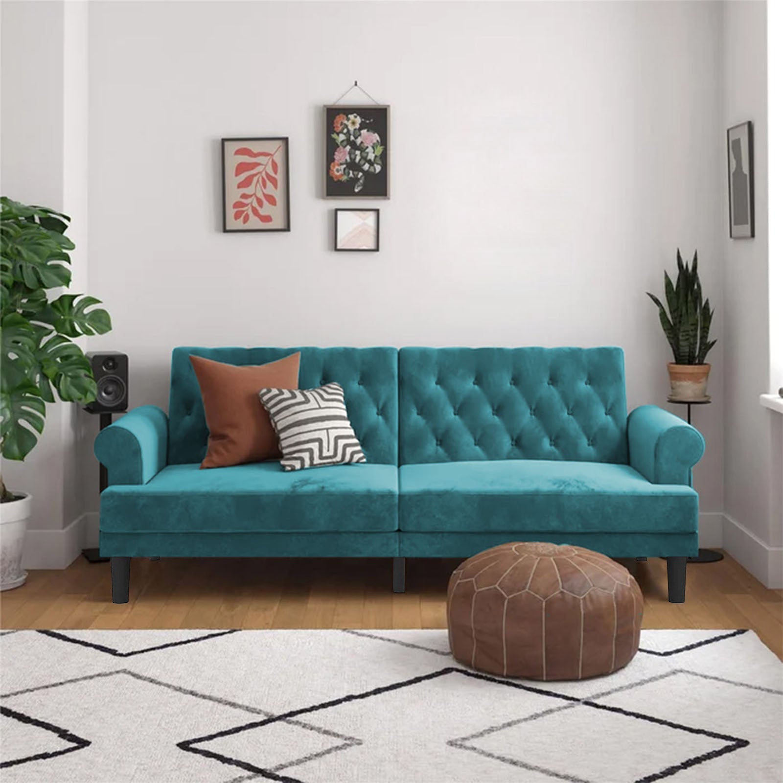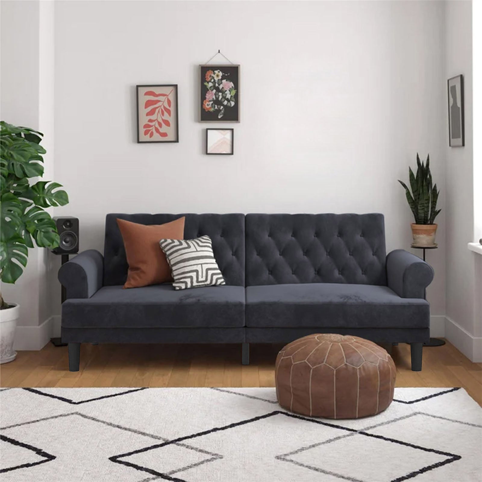 • تصميم أنيق بأذرع ملفوفة منجدة وبأزرار على وسائد الظهر