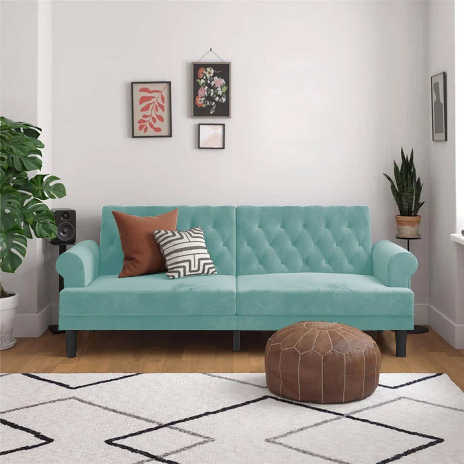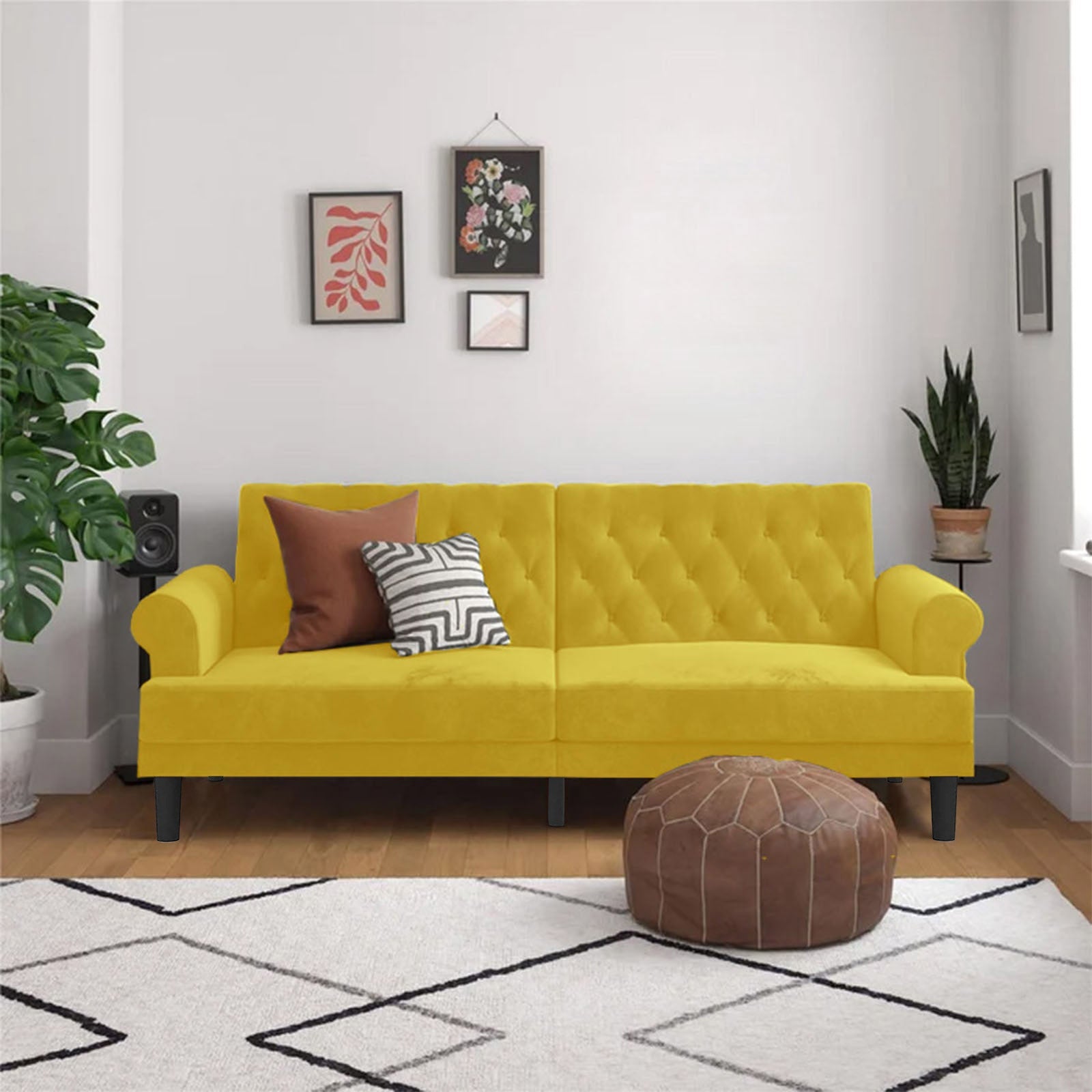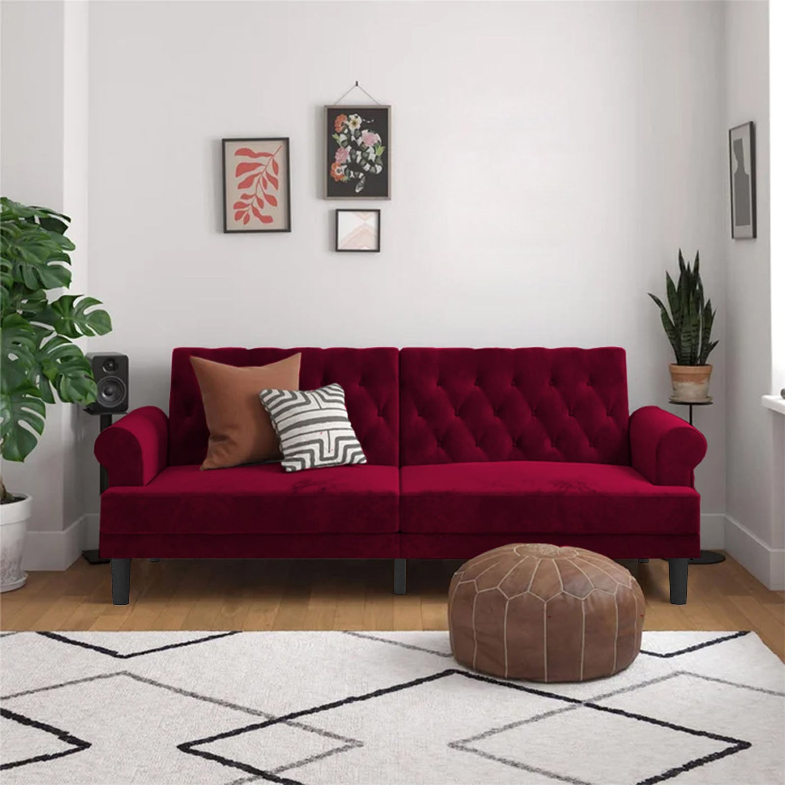 • تصميم أنيق بأذرع ملفوفة منجدة وبأزرار على وسائد الظهر
