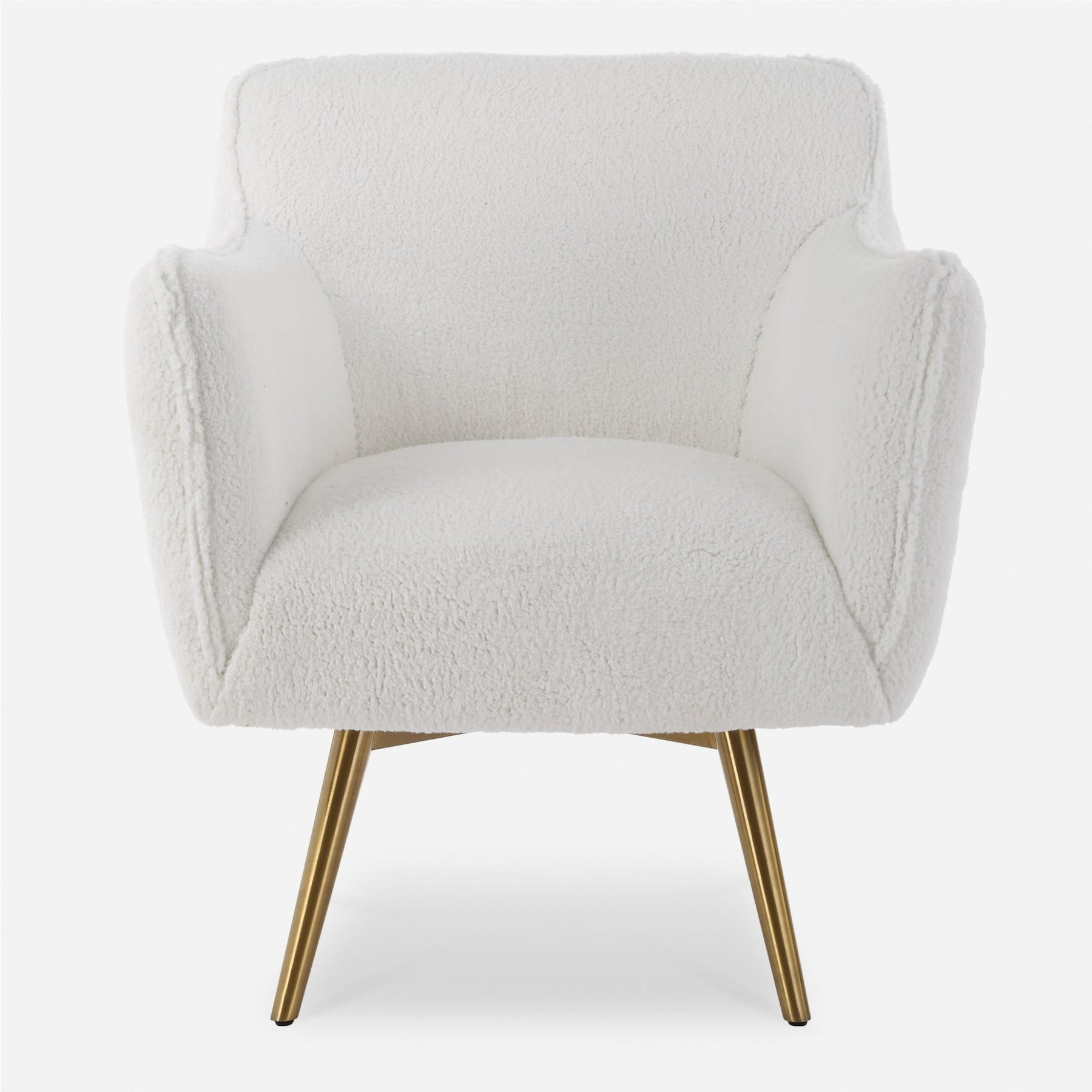 Nestle Into The Surrounding Comfort Of The Oasis Swivel Chair. Gently Sloped Curves Are Accentuated With A Welt Trim Of An Ultra Plush White Faux Sheepskin Fabric. Complete With A Swivel Return Atop Tapered Stainless Steel Legs Plated In Brushed Brass.