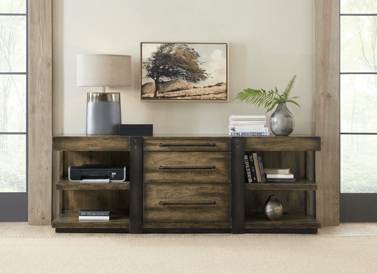 With an authentic, aged character, the Crafted Credenza is constructed of Oak Veneers, metal sheet and leather-wrapped hardware. The Tobacco Leaf finish is reminiscent of a bourbon barrel burnished over time. Used with the leg desk or standing alone, the credenza has one keyboard drawer, one utility drawer, one file drawer with pendaflex letter/legal file system and metal-wrapped posts. When used with the 1654-10458-DKW1 Writing Desk, the credenza can be placed on the left or right side to create an L-shaped work space.