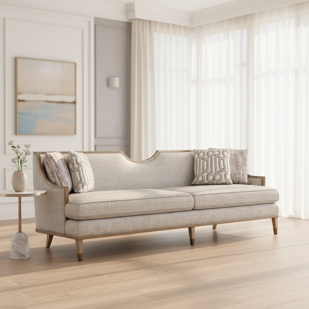 Clean and classic, the sleek Harper Sofa brings together elements of both contemporary and traditional design: square tapered wood legs, exposed wood frame, curved arms, and a reverse half moon cut out on the back finished in a soft silvery metal.