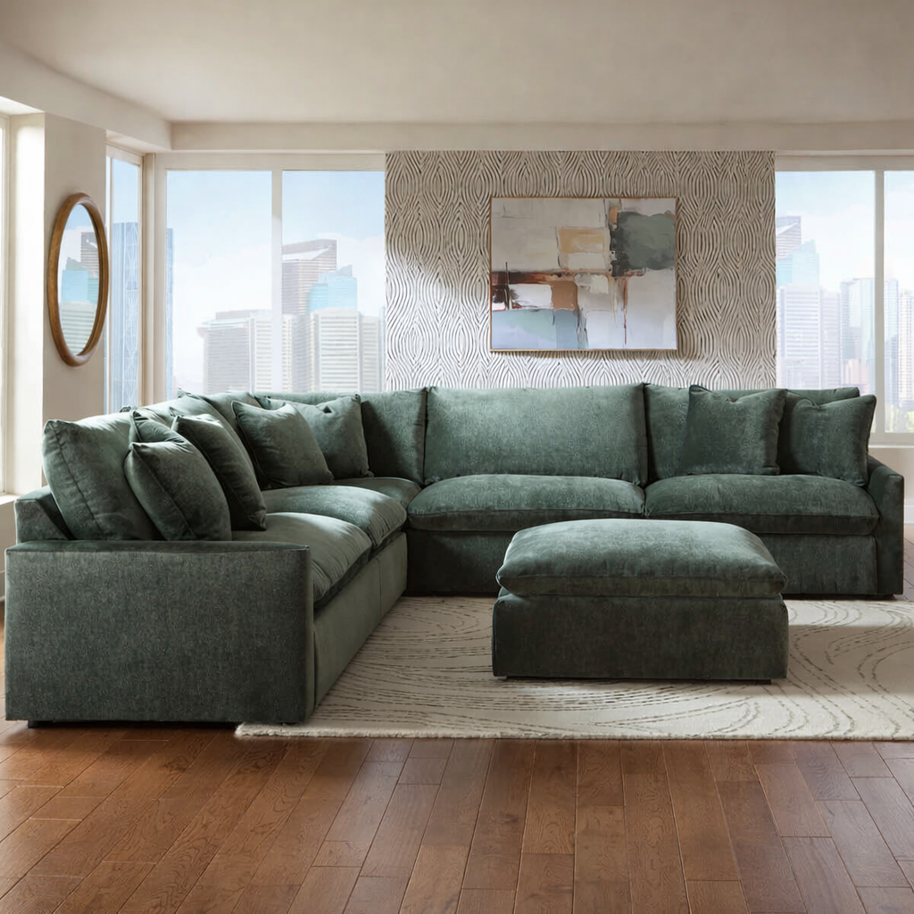 Discover a sectional that perfectly balances modern design with timeless elegance. Featuring gently tapered arms for a refined transitional style and large reversible cushions for ultimate comfort, this piece invites relaxation. The richly textured jade green chenille fabric adds a sophisticated touch, making it an ideal choice for stylish, everyday lounging. Experience comfort and class combined in one exceptional sectional.