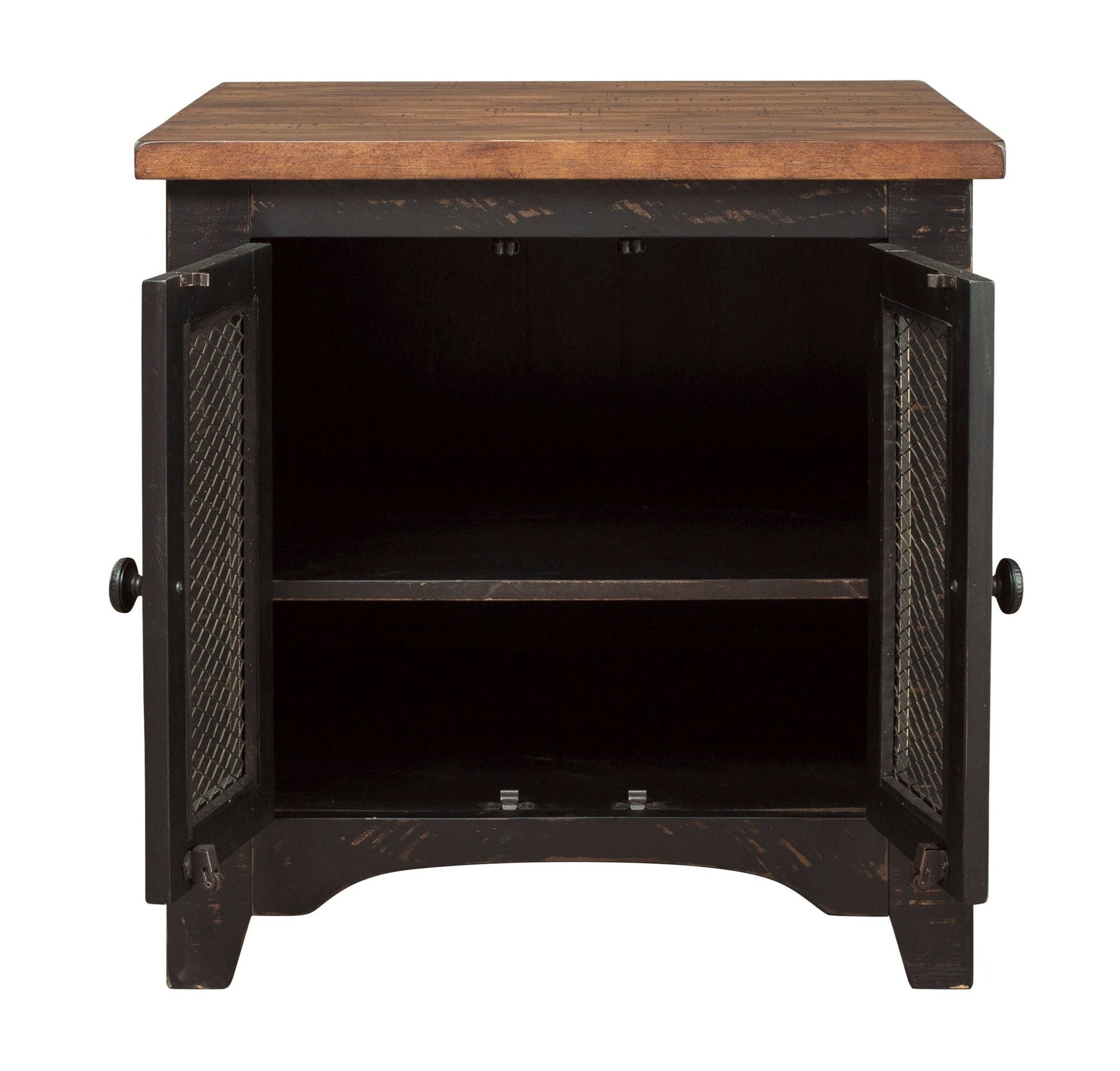 To those with an eye for the best in rustic farmhouse living, the two-tone Valebeck end table doubles up on charm. Designer touches include plank-effect styling, distress marks and wire mesh door fronts for added character.