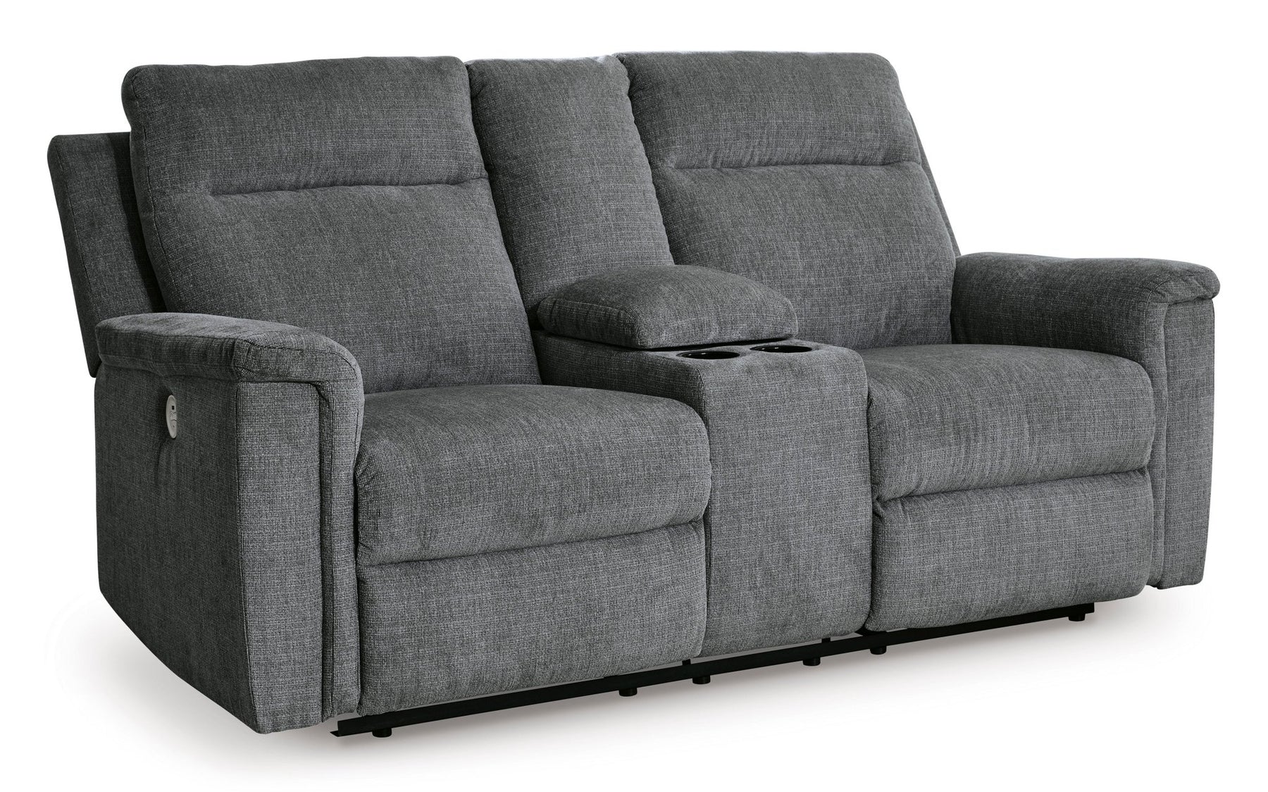 Fabric, DBL REC PWR Loveseat w/Console, Light, One-touch power control with adjustable positions and zero-draw USB port;Zero-draw technology only consumes power when the USB receptacle is in use;Corner-blocked frame with metal reinforced seat;Attached cushions;High-resiliency foam cushions wrapped in thick poly fiber;Polyester micro chenille upholstery;Center console with 2 cup holders and hidden storage;Power cord included; UL Listed