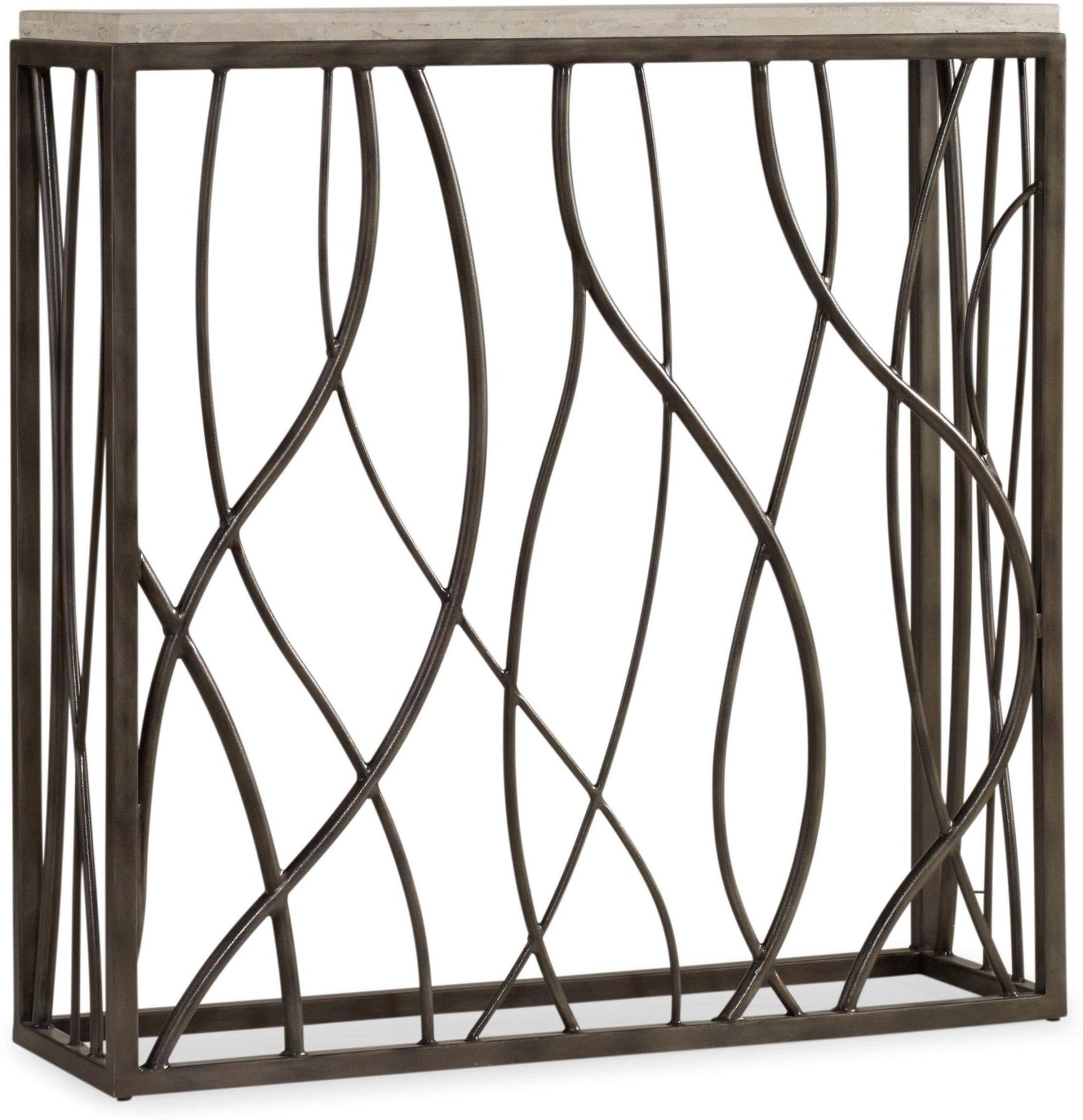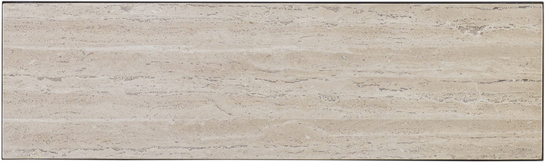 Organic and modern, this striking thin metal console in a neutral color palette has a curvy steel base and natural stone top of Travertine Marble to create an inviting focal point with a compact 40W x 12D footprint.