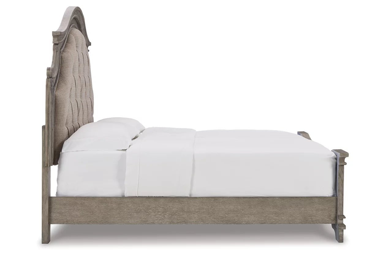 Cottage quaint styling and quality construction make the Lodenbay king panel bed a dream come true. An antiqued gray finish and beige upholstery provide rustic warmth. The ornately shaped headboard marries classic design with homey charm for an elegant bedroom must-have.