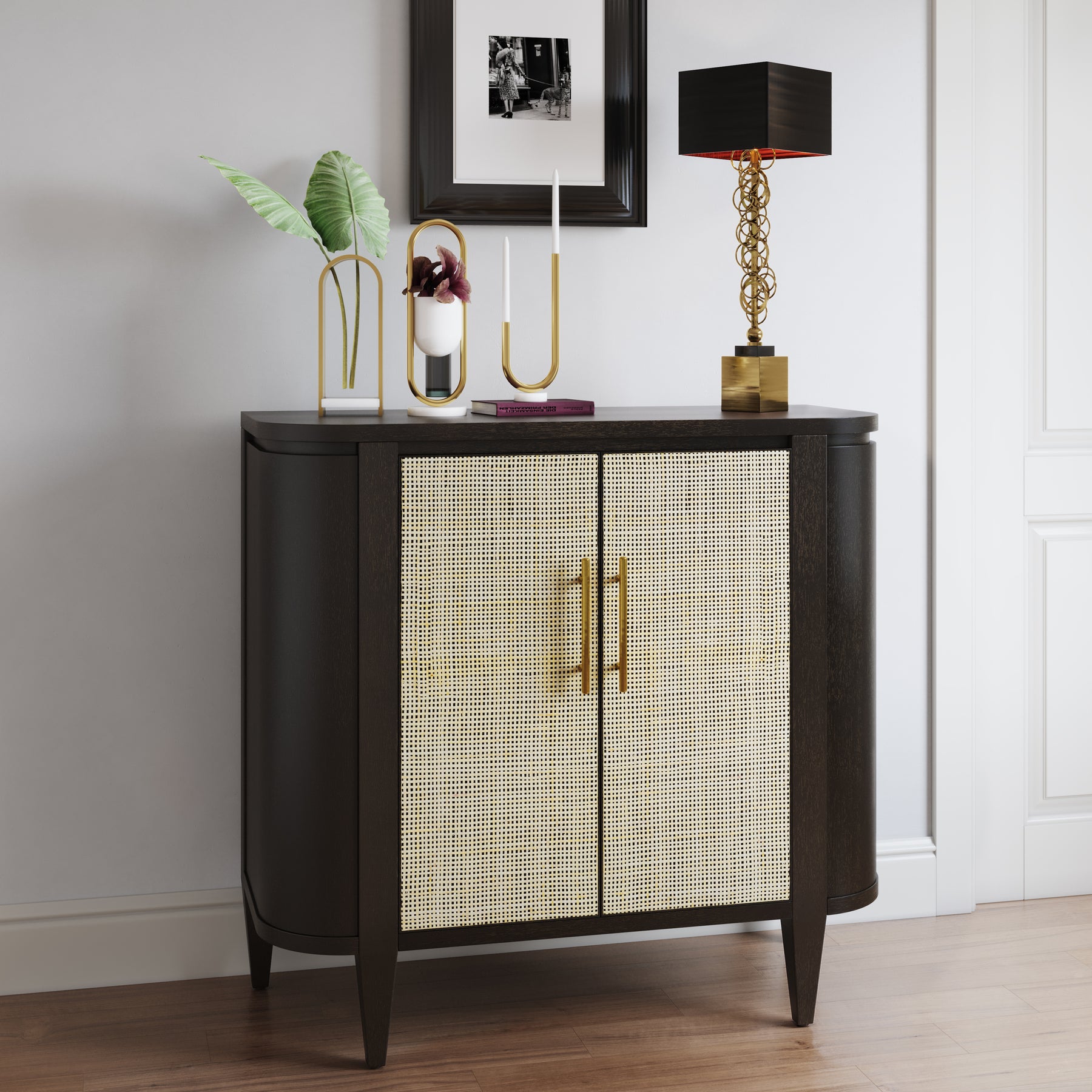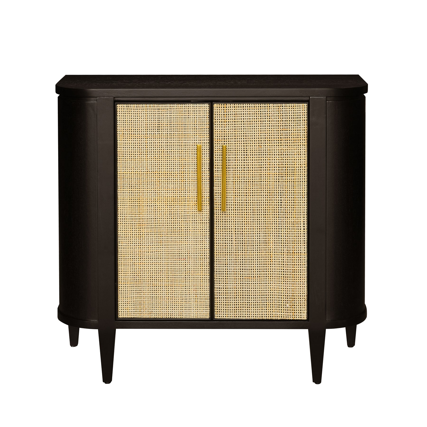 Modern contemporary styling, this piece offers function and versatility,Two doors open to reveal a large storage compartment with one adjustable shelf,Frame is constructed with hardwood solids and quartered oak veneers in a matte black finish, while the doors utilize natural cane in a box-weave pattern,Slim, minimalist handles in a brushed gold finish,Constructed with solid woods and metal for durability,Ships fully assembled, no assemby required
