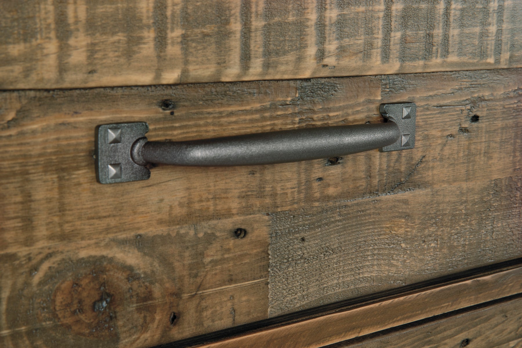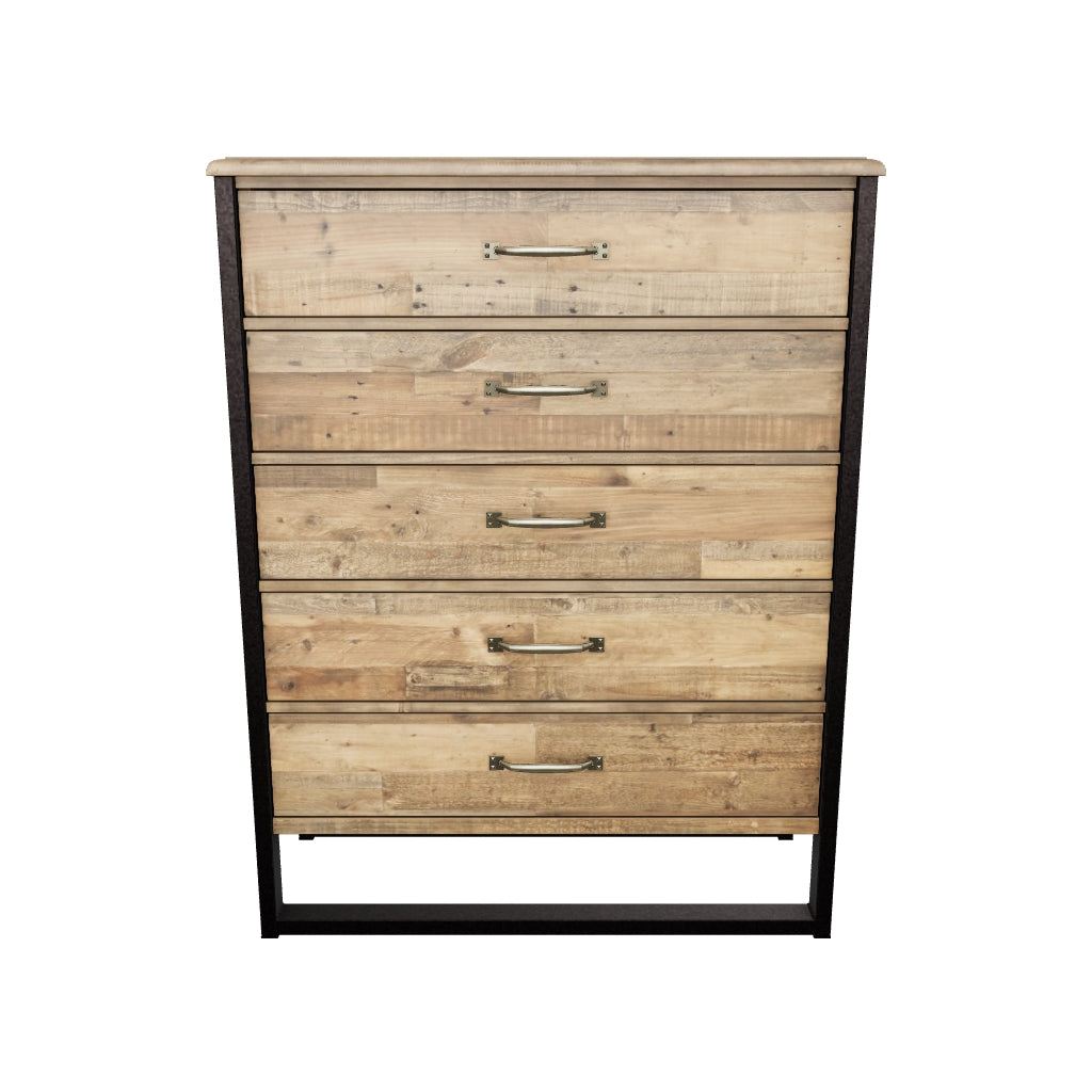 Made with reclaimed pine wood;Light grayish brown finish;Silver/bronze-tone hardware;5 smooth-operating drawers with dovetail construction;Metal leg brackets;Small Space Solution;Includes tipover restraint device