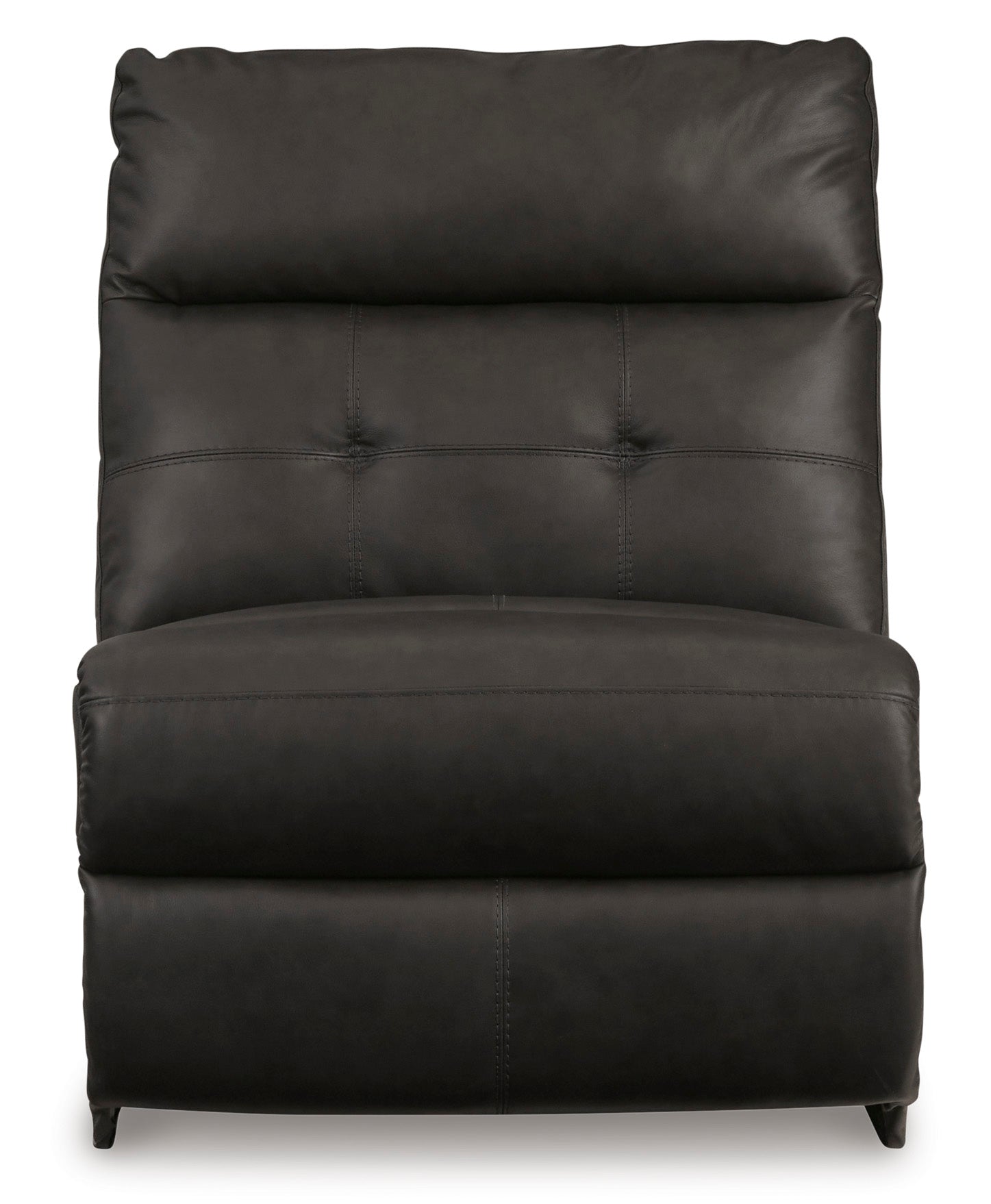 This armless chair is made with leather and faux leather upholstery. Pairs with other items in the series to make a modular sectional.