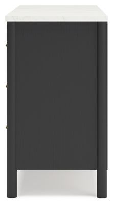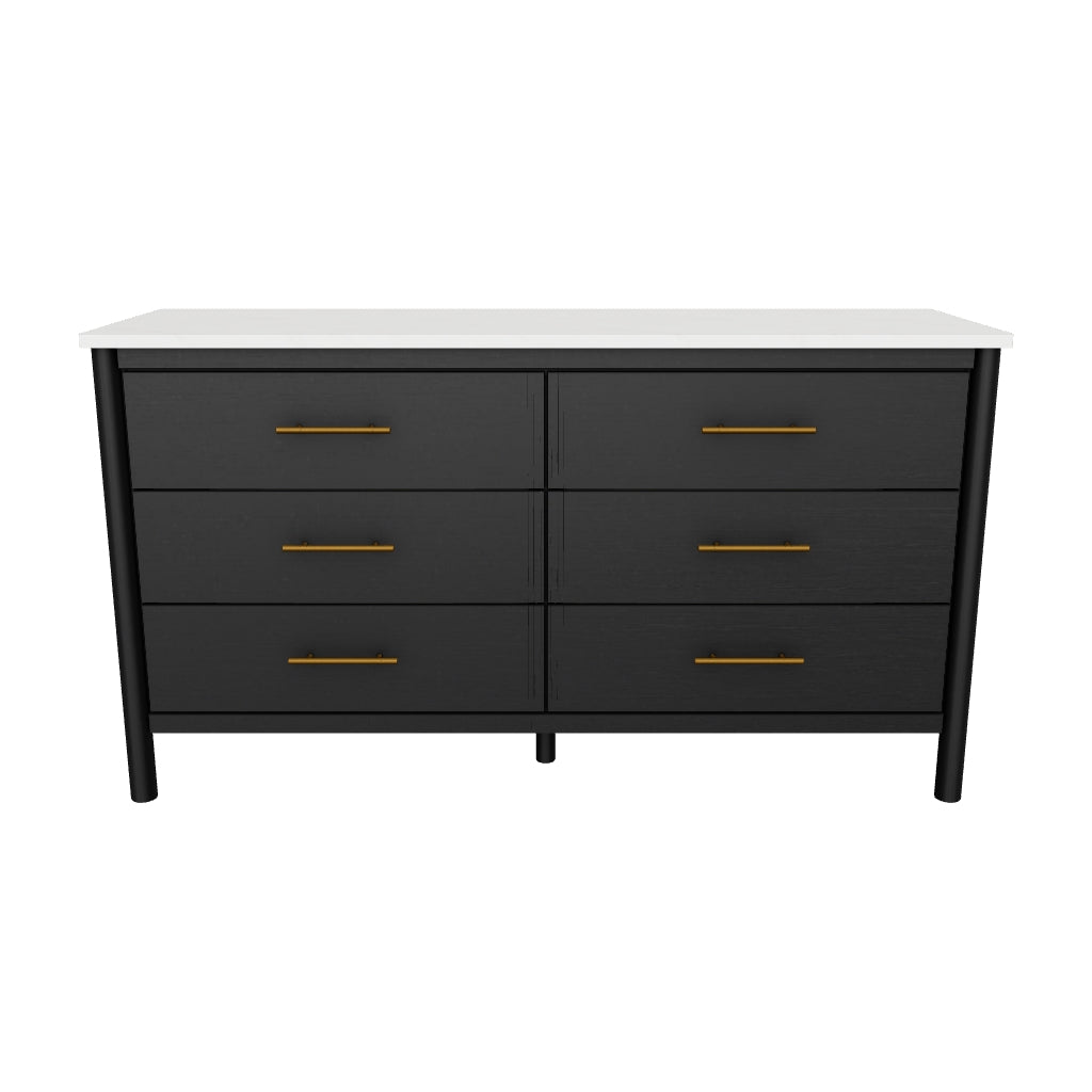 Six Drawer Dresser,,Made with engineered wood (MDF/particleboard/plywood) and decorative laminate for the right balance of affordability and durability;Matte black finish with subtle replicated wood grain;Replicated white marble top;Decorative laminate replicates natural or man-made material surfaces with consistent color, pattern and texture;Handles with light bronze-tone finish;6 smooth-gliding drawers;Drawer interiors are lined with a faux linen laminate for a clean, finished look;Safety is a top priority, clothing storage units are designed to meet the most current standard for stability, ASTM F 2057 (ASTM International);Drawers extend out to accommodate maximum access to drawer interior while maintaining safety;Minor assembly required