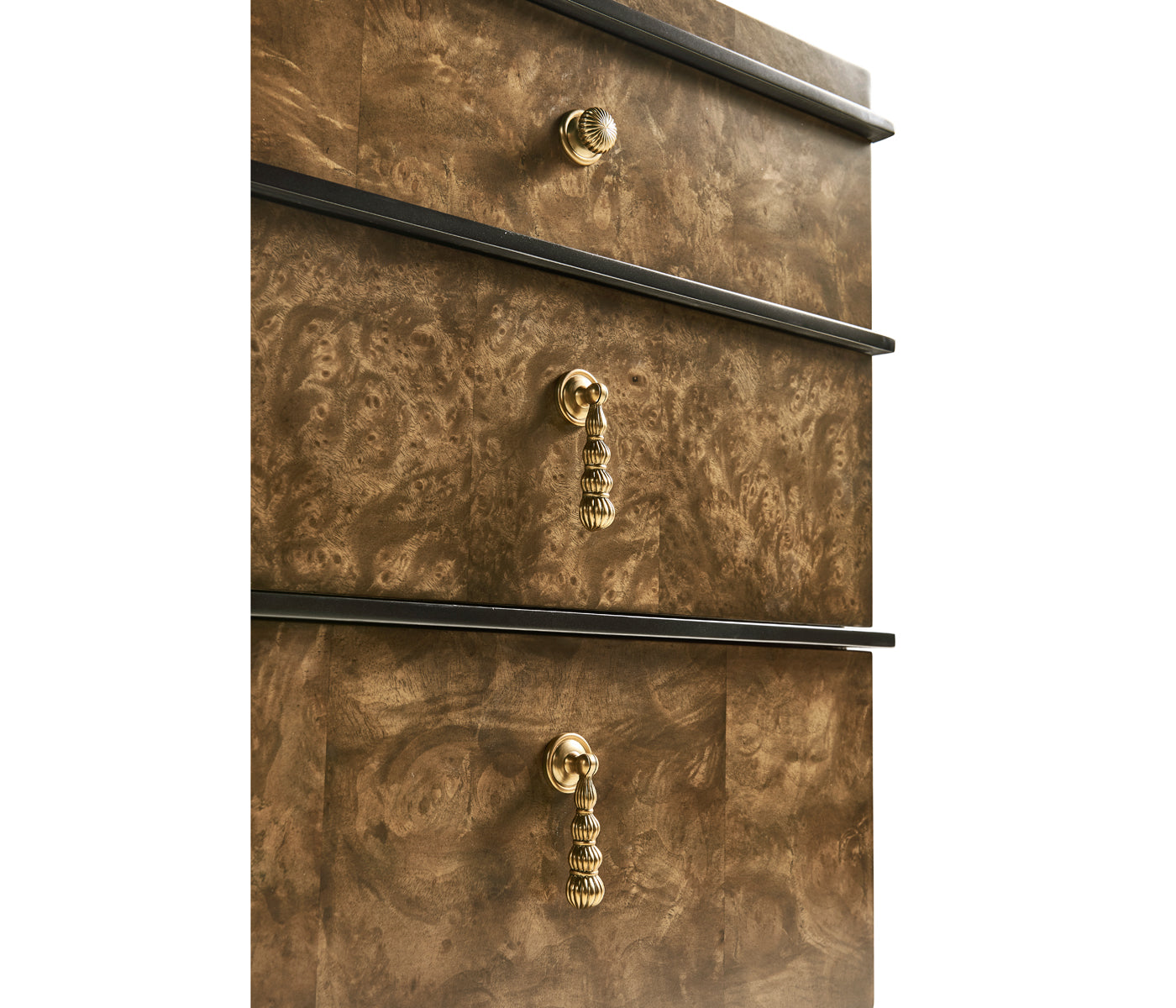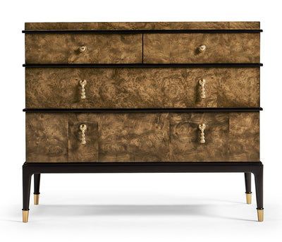 Step into the world of modern design with the Jacques chest. Its clean lines, bold contrasts, and minimalist elements define its contemporary charm, making it a statement piece that seamlessly blends with contemporary interiors. The piano black lacquer accents provide a striking contrast against the dyed brown burl veneer, creating a visual harmony that captivates the eye. This juxtaposition of materials adds depth and drama, making the chest a true work of art. Brass accents not only enhance the aesthetics but also elevate the chest, giving it an air of elegance that complements its contemporary design.