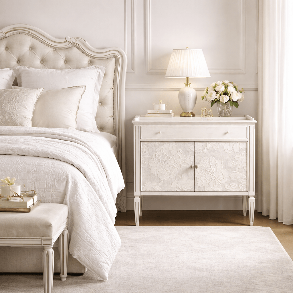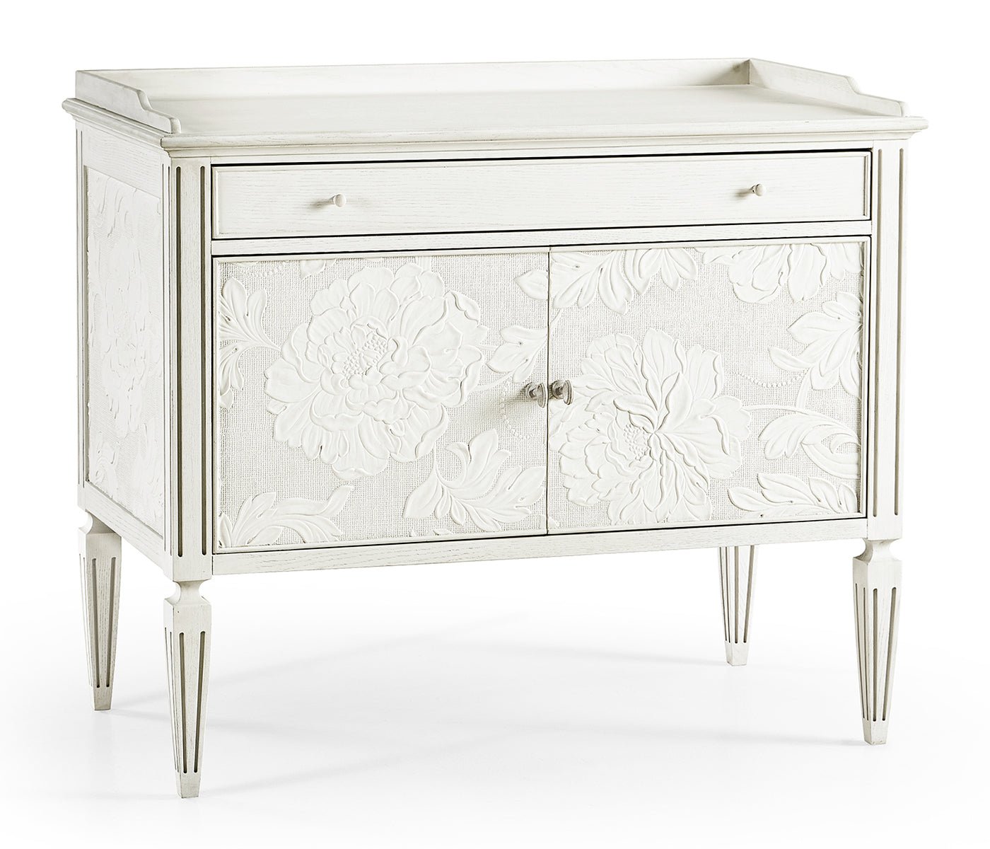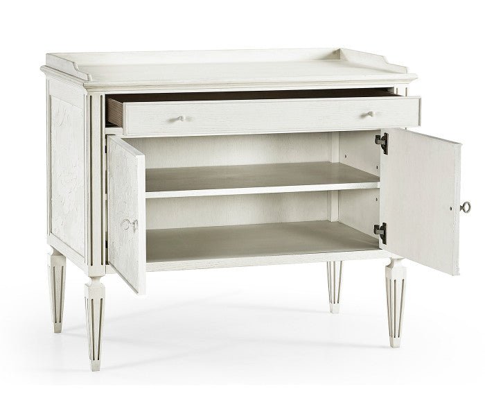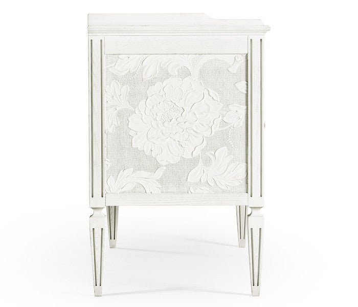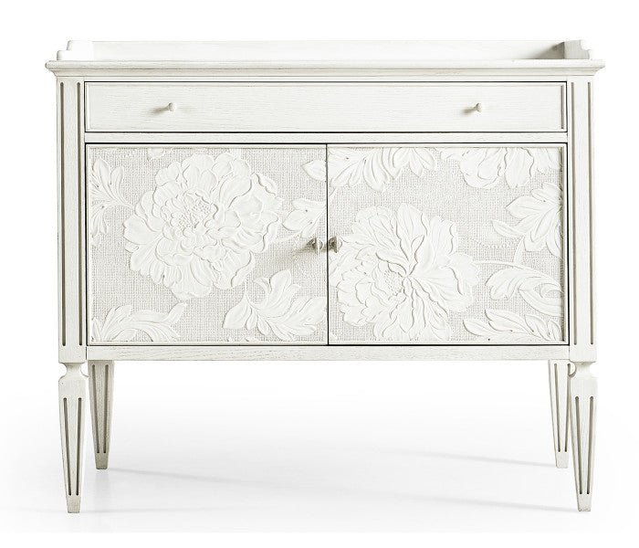 Jonathan Charles’ Mammatus night chest combines the style and aesthetic artistry of Victorian refinement with delicate floral patterns painstakingly crafted combining Lincrusta wallpaper and plaster sculpting techniques. Balanced on stunning tapered legs and bathed in chalky white finish with gray accents, Radiatus creates a lasting impression.