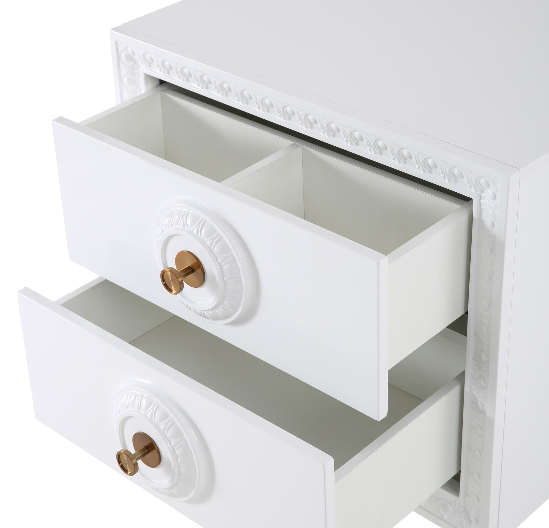 Add an element of fabulously glam fashion with the Bovey side table. Featuring a lacquer finish with intricate molding, gold hardware and tons of storage space, it's available in two colors to suit your fashionable taste.