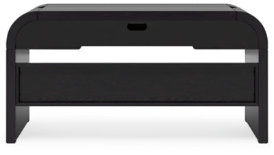 Inspired by art deco design, the softly shaped Rowanbeck home office desk makes a lasting impression in a simply stunning way. Its magnificent curved silhouette is enhanced by a rich layered black finish on the textured wood grain surface. Complete with ample storage, a pull-out keyboard tray and USB charging, this is the all-in-one piece you’ve been looking for to elevate your contemporary workspace decor.