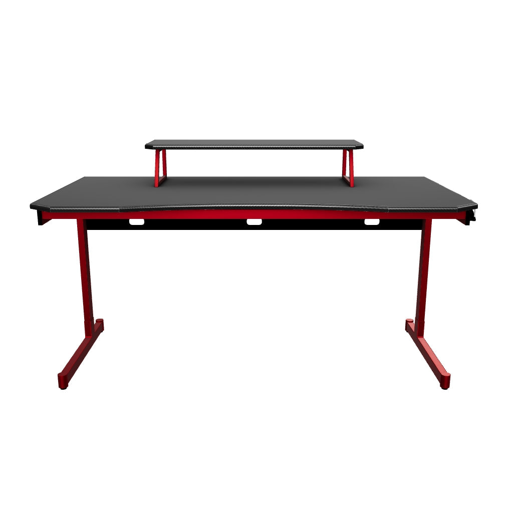 Made with engineered wood and durable decorative laminate;Metal frame with red powder coated finish;Raised monitor stand;Headset hanger mounted on side;Raceway underneath top for cord management;Assembly required