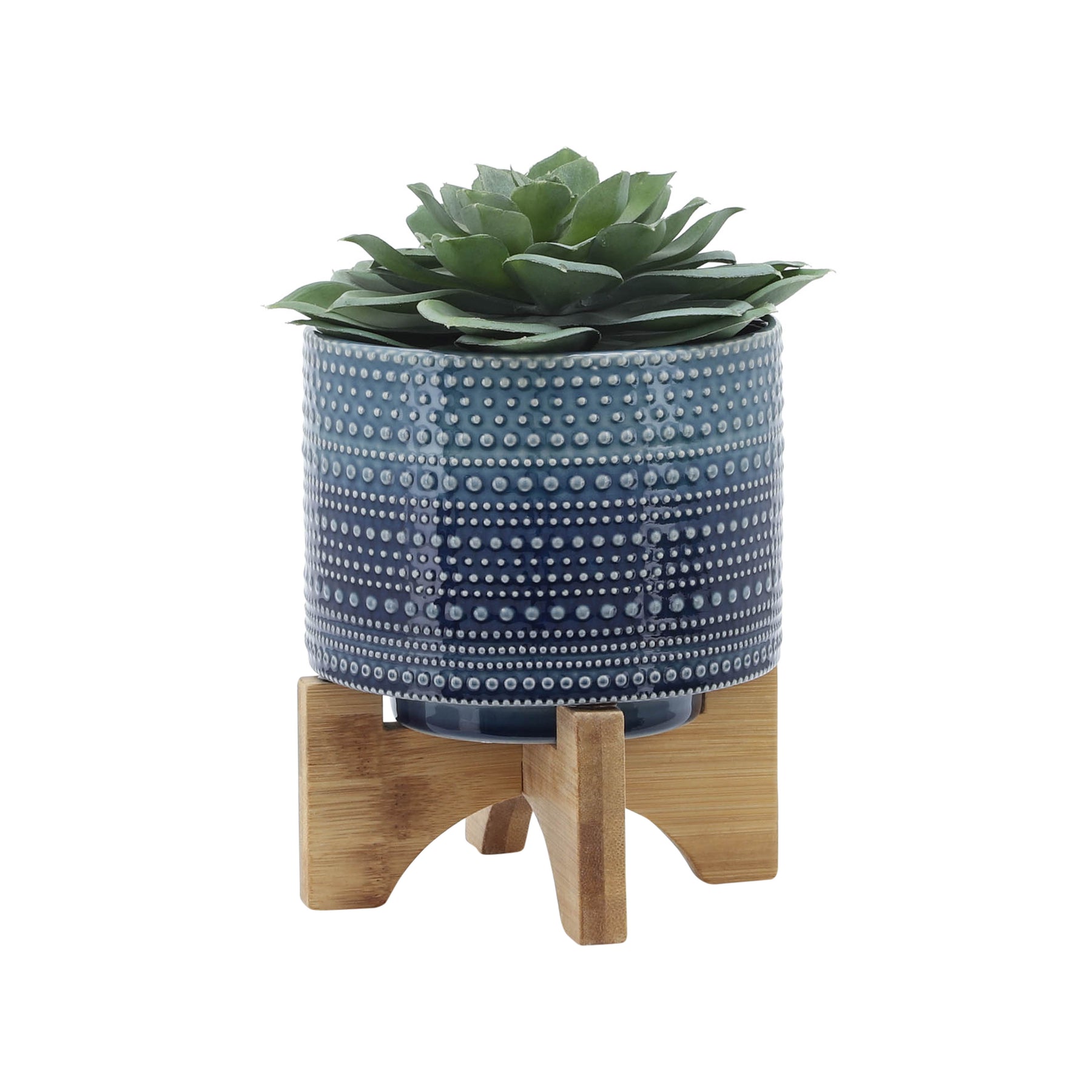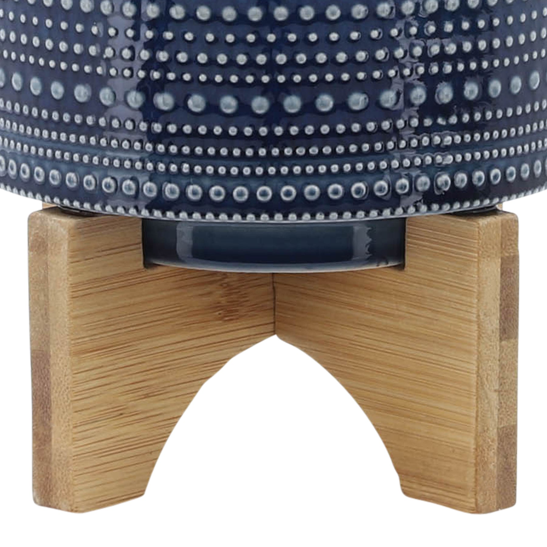 6" DOTTED PLANTER W/ WOOD STAND, BLUE