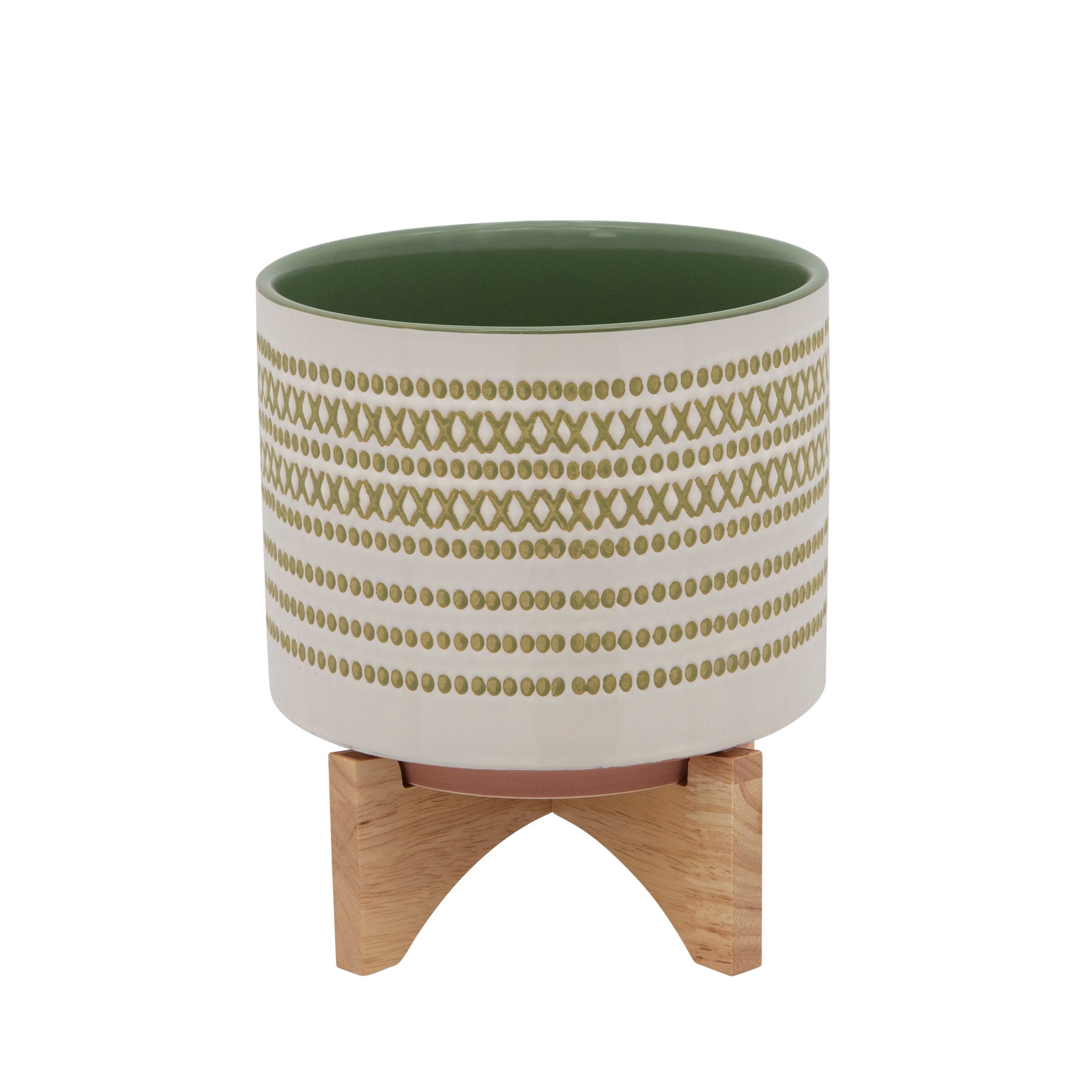 8" AZTEC PLANTER W/ WOOD STAND, OLIVE