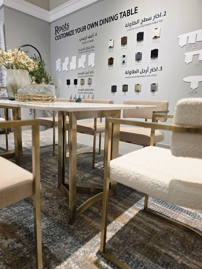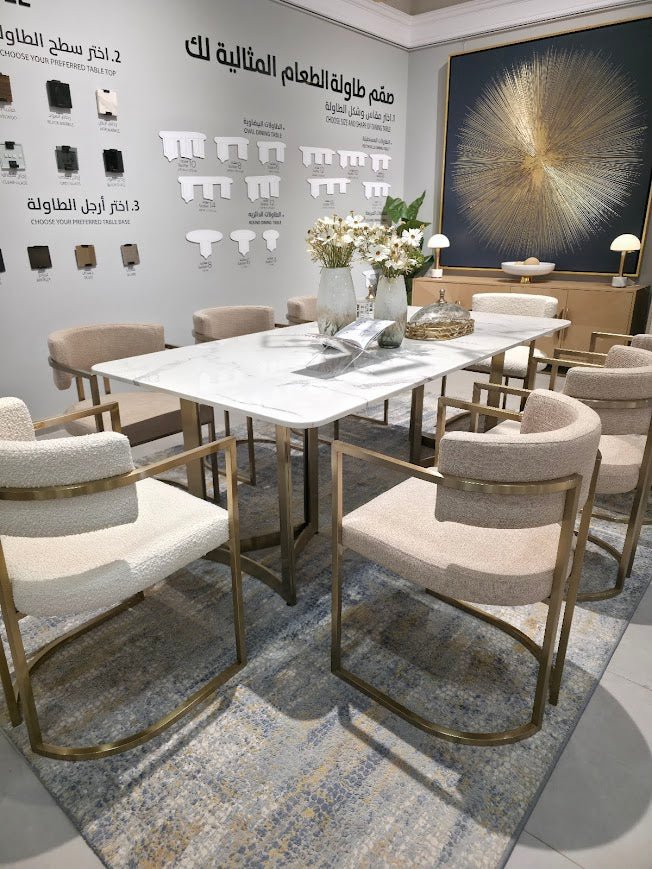 Alexa White Marble Dining Table Gold Base with 8 chairs - Al Rugaib Furniture
