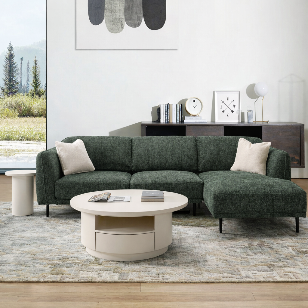 This modern design Frosty Sectional Set embodies sophisticated style with its smooth curves and luxurious upholstery. Upgrade your living space with this elegant set, perfect for lounging, entertaining, and curling up for movie night. Invite guests to your home and lounge in luxury with the Frosty Sectional Set.