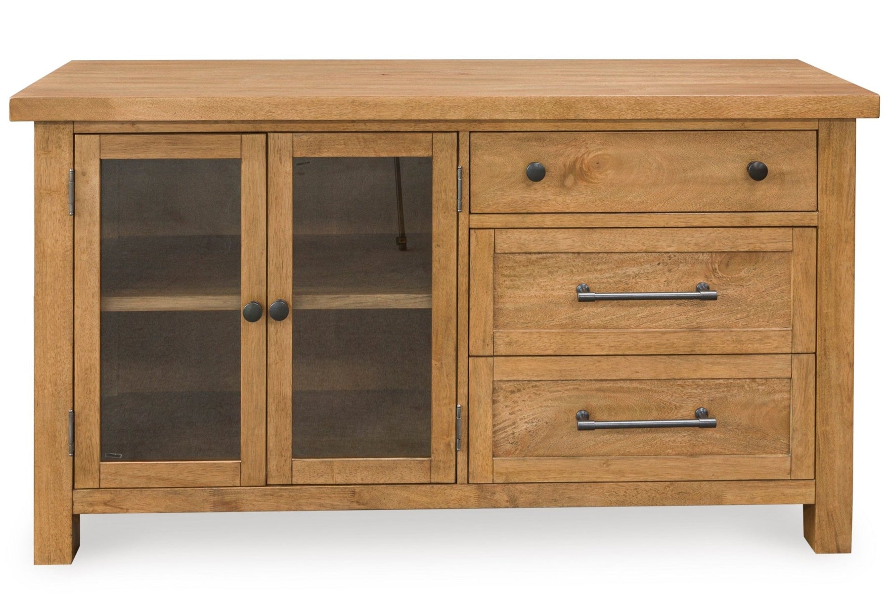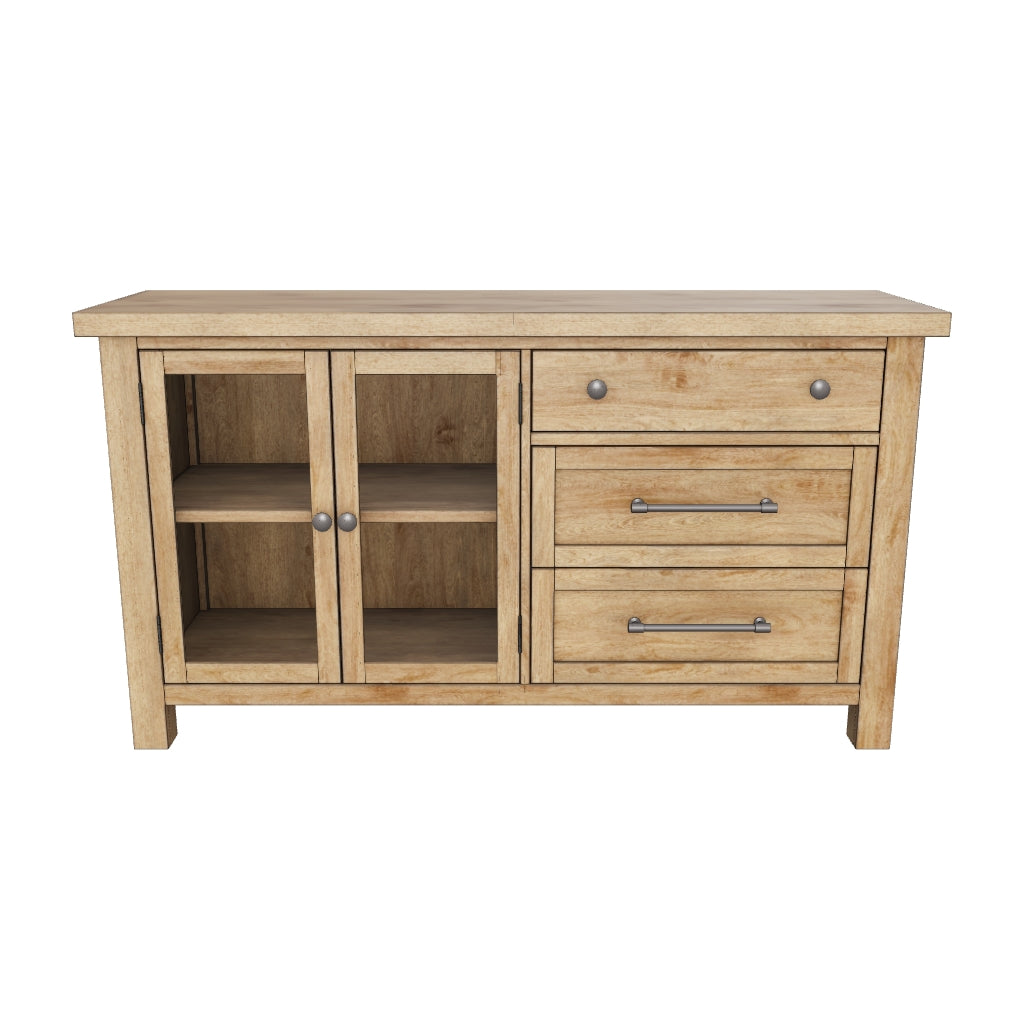 Glass;Wood Products and Other, Dining Room Server, , Made with hardwood solids, mango wood veneer and MDF substrate;Light wood-tone finish;Metal handles and round metal knobs with black finish;2 glass cabinet doors;Adjustable shelf;3 drawers with felt lining, dovetail construction and heavy duty ball-bearing side glides (top drawer felt lined);Assembly required