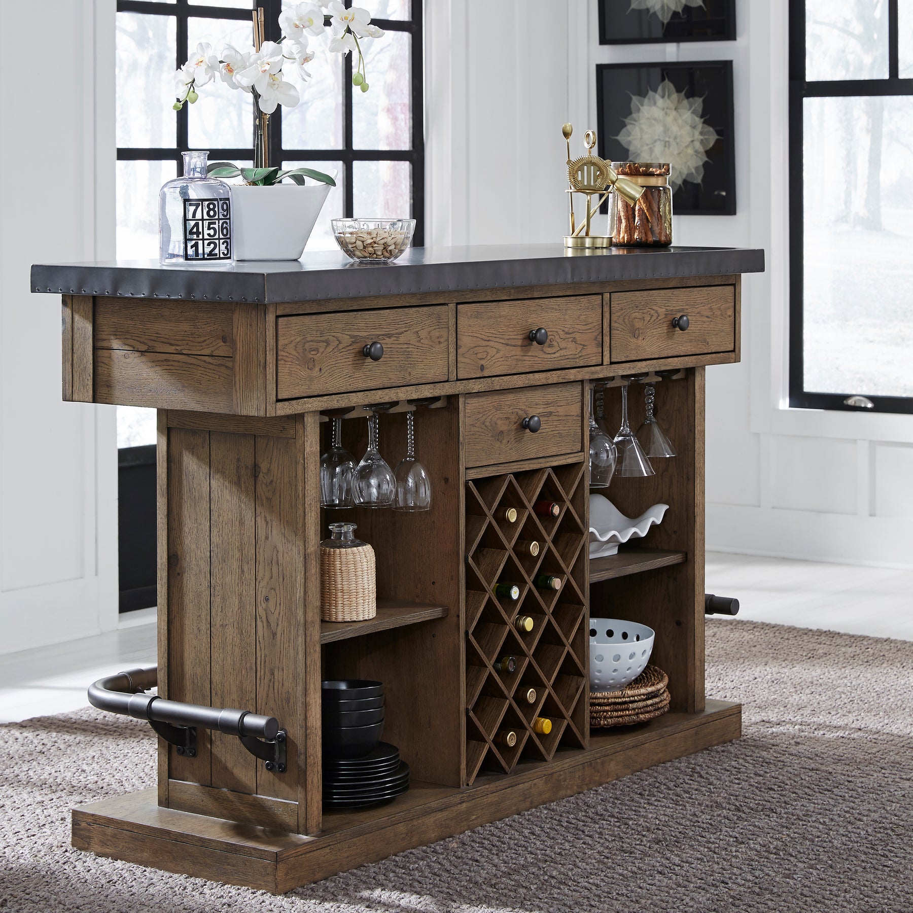 Industrial styling with a rustic feel,Features storage for wine bottles and four drawers to stow linens and bar utensils,Light-hued oak planks for a rustic feel,Steel-toned metal top and pipe-style footrest,Sturdy frame crafted of solid wood, manufactured wood, and oak veneers for lasting beauty and functionality,Assembly is required; hardware kit and instructions included.