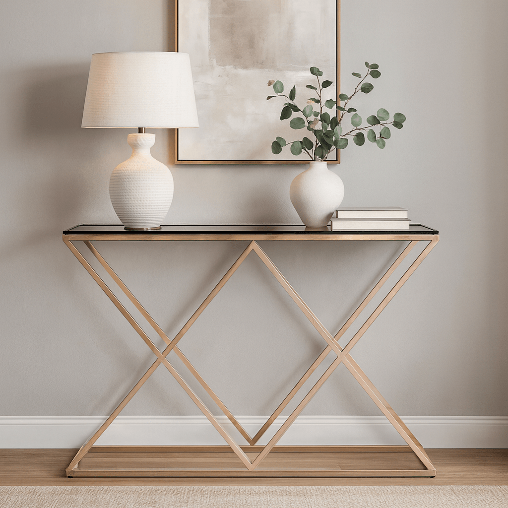 STAINLESS STEEL & GLASS CONSOLE TABLE, GOLD KD