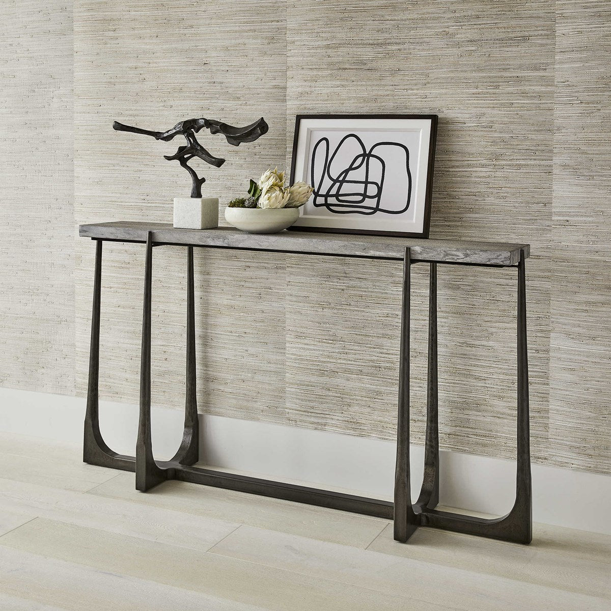 Six legs, cast of hand-forged steel, taper to encapsulate a sand-blasted Monsoon Black Marble top. The famous marble, known for its flowing linear patterns, showcases tones of gray, white and black. The steel base has a gunmetal finish with adjustable foot levelers included.
