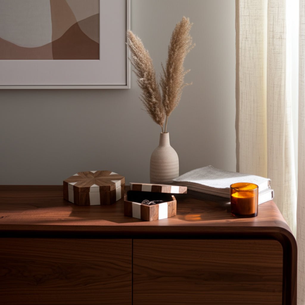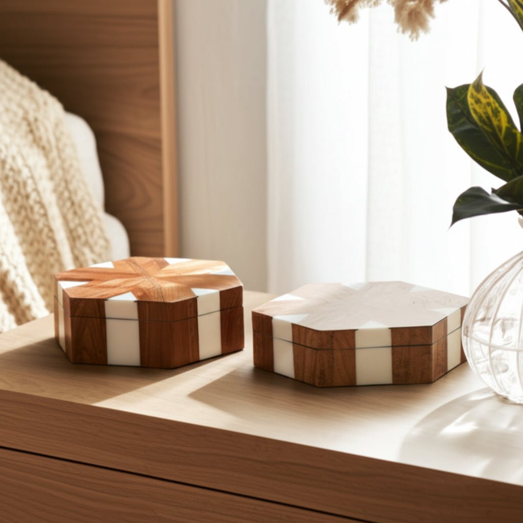 S/2 10/12" Wood Inlay Hexagon Boxes, Natural/white