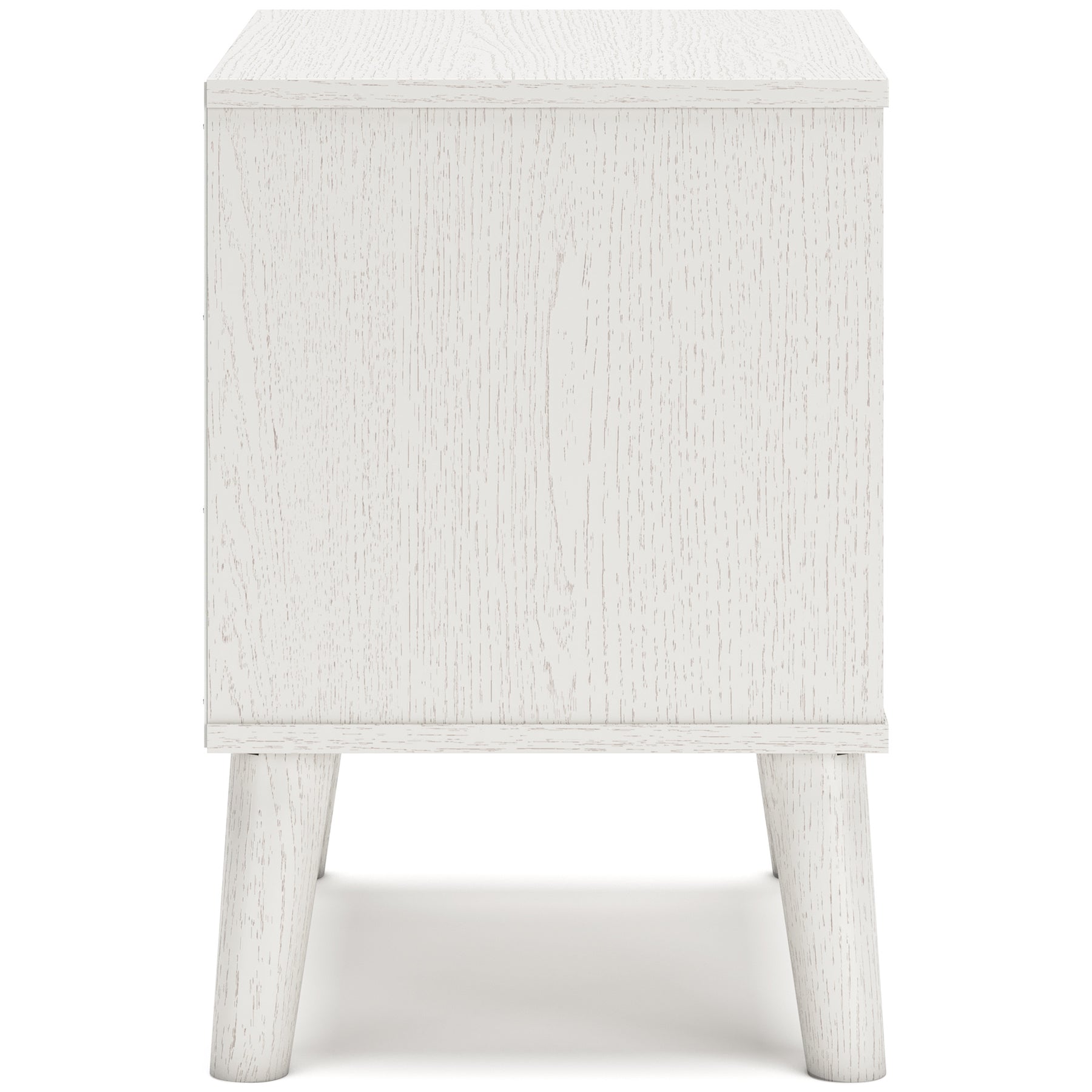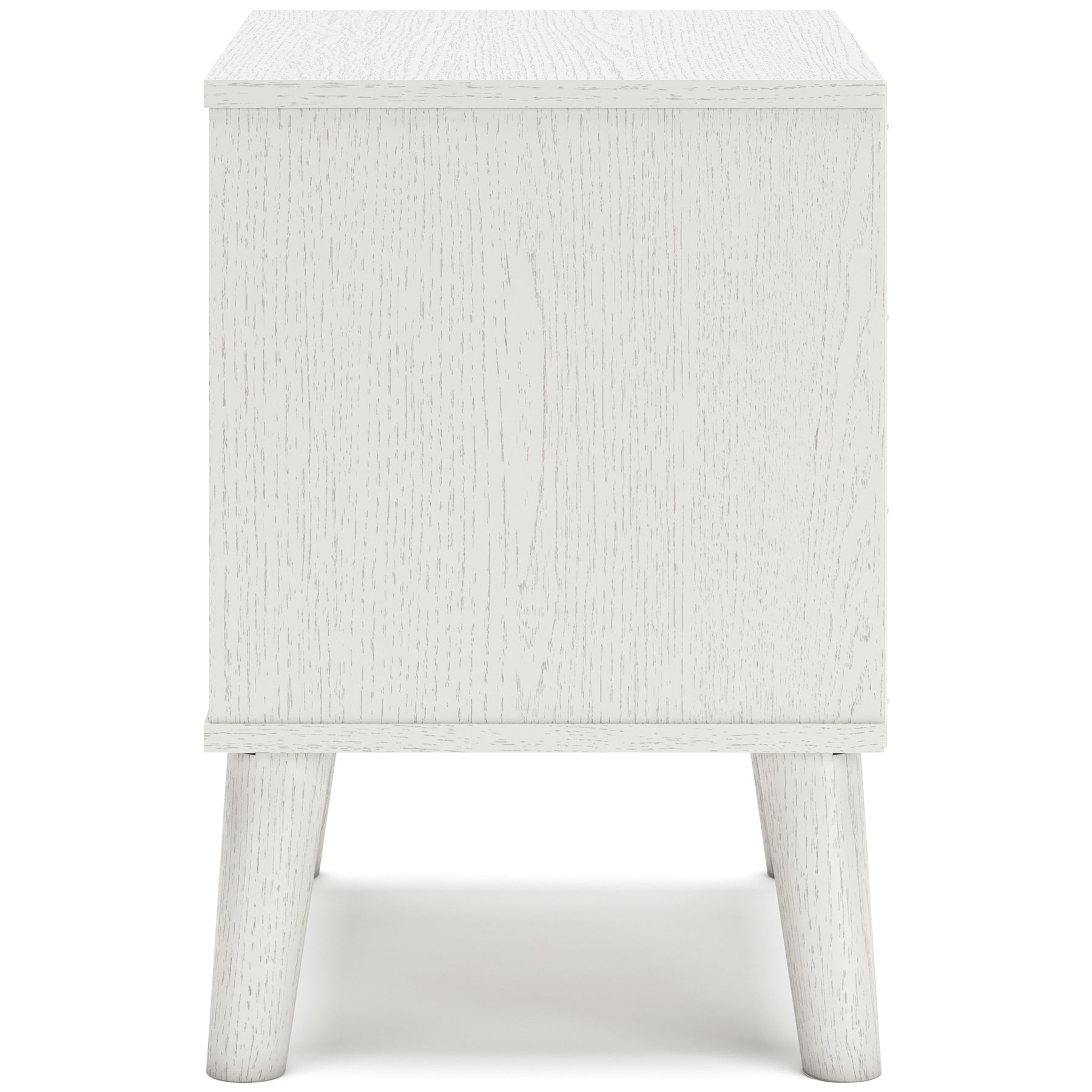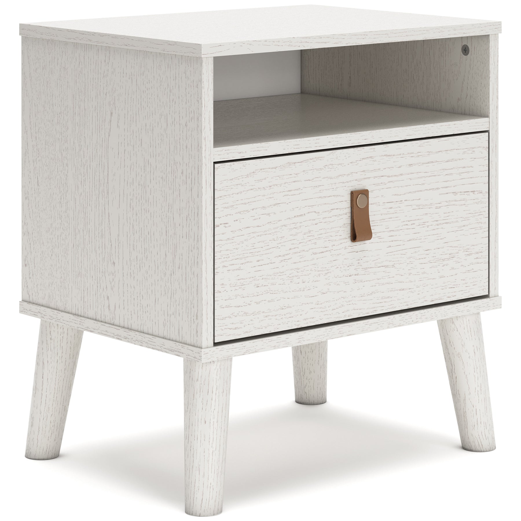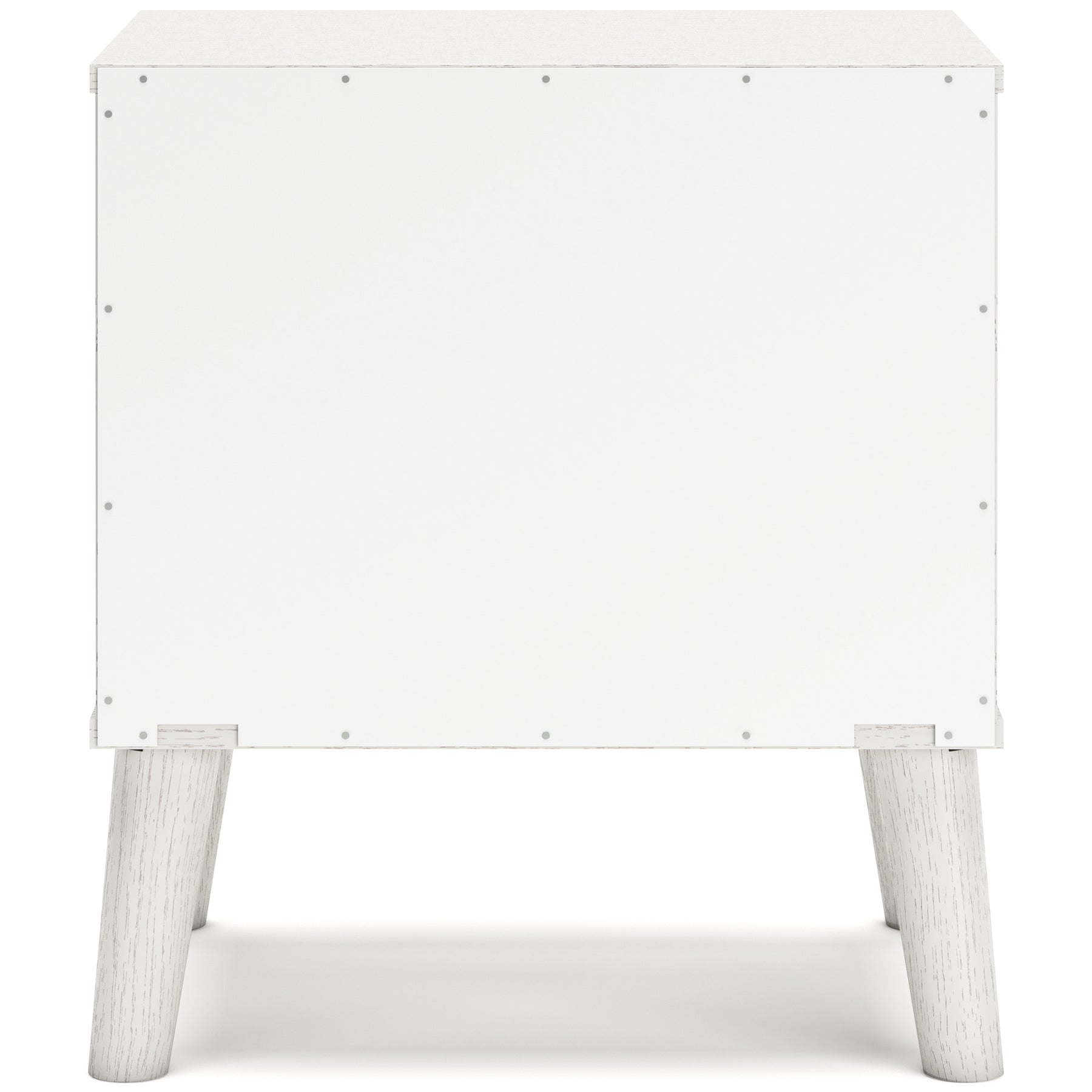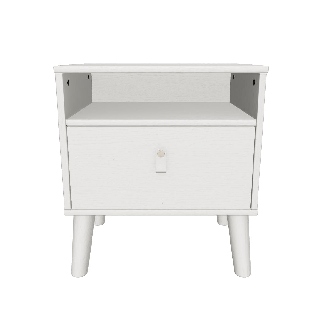 Dare to take minimalism to the max. This nightstand has an air of sleek simplicity thanks to its white painted finish with subtle replicated wood grain. Magnificently mod splay legs are a compelling complement to the streamlined design. And with two different faux leather drawer pulls that allow you to customize the nightstand to suit your space, there's no doubt about it: This contemporary piece is sure to become a classic.