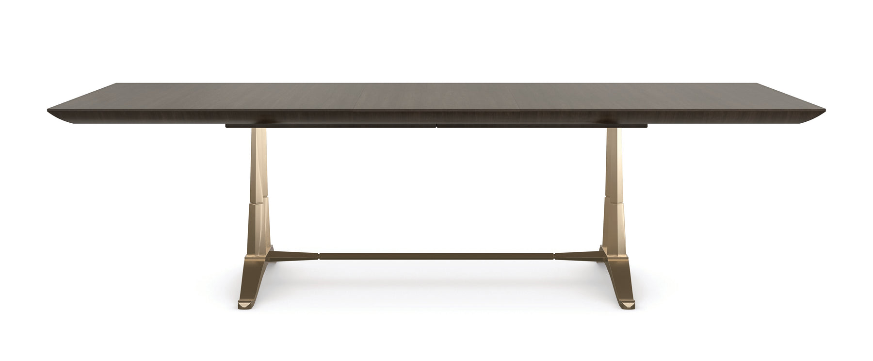 Dually inspired, this modern take on a classic French trestle table recalls the vaulted ceiling of Musee D’orsay, a former Beaux-Arts railway station, and the elegance of a slipper with the same name. Balanced on its Champagne Gold metal frame, an expansive tabletop warms the room with richly grained, tupelo veneers in an Otter finish. Expands to 112” with a single leaf for impromptu parties and surprise dinner guests.