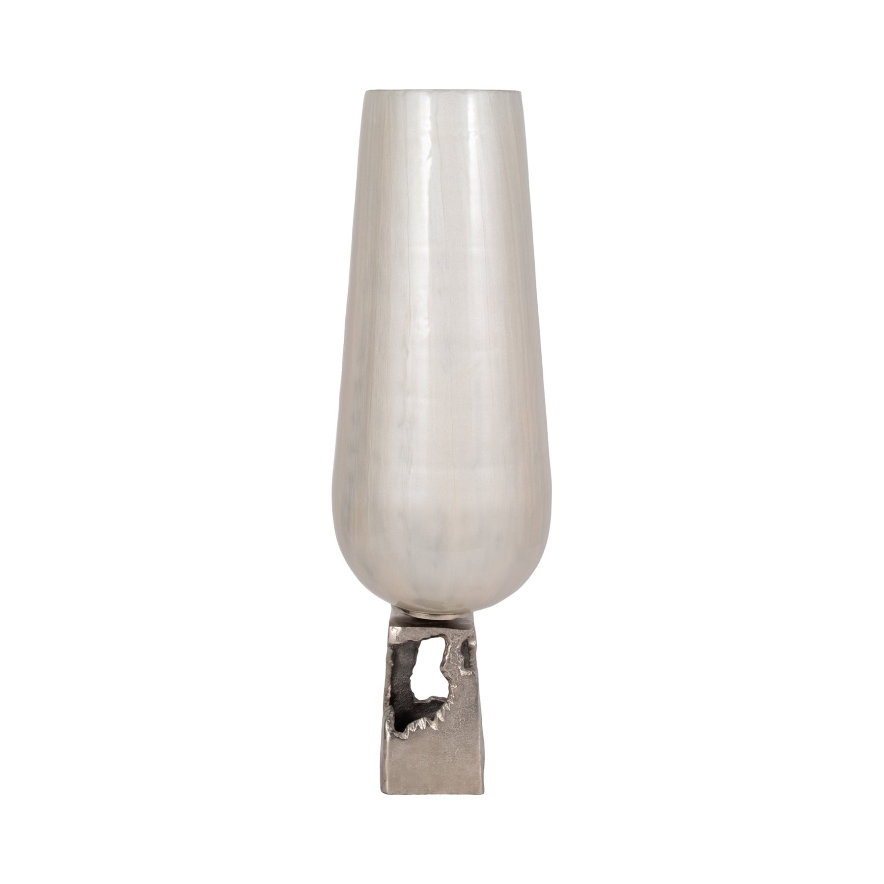 GLASS, VASE W/ METAL BASE, PEARL WHITE