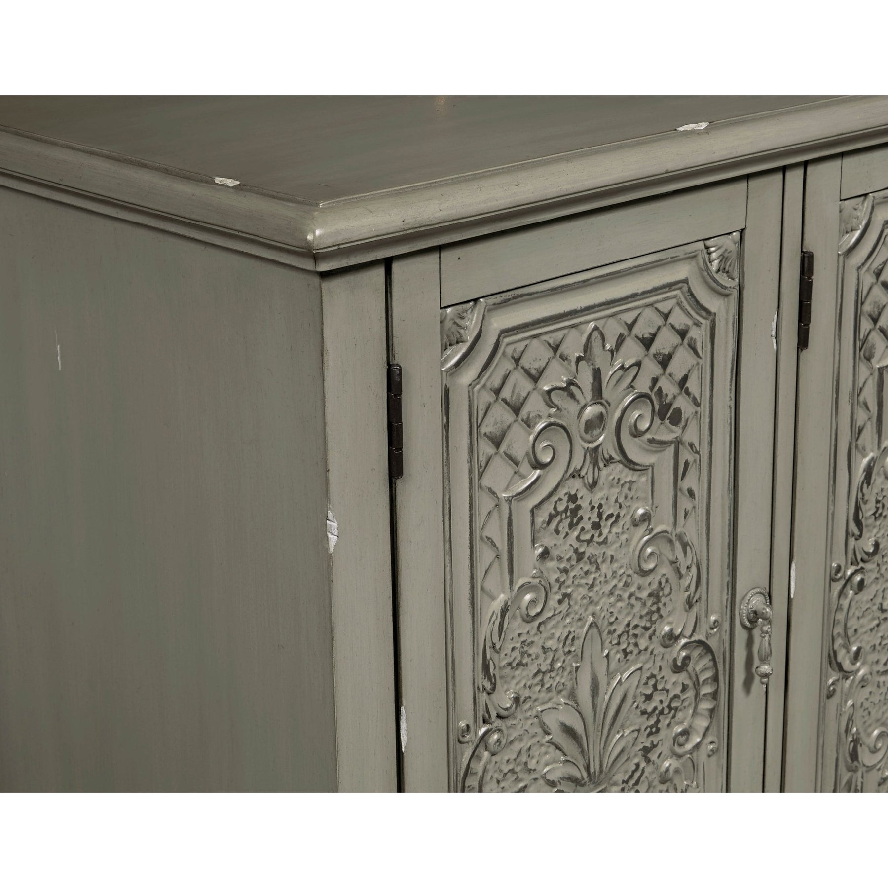 Antique style, intricate designs, and a neutral color infuse artistry into this credenza,Raised door front design is inspired by tin panels and perched on decorative carved feet,Soft grey painted finish features rub through and distressing for a distressed look,Painted, pewter-finished door hardware adds a pleasing vintage feel,Select hardwoods and manufactured wood offer durability and longevity,Minimal assembly required; feet screw into base